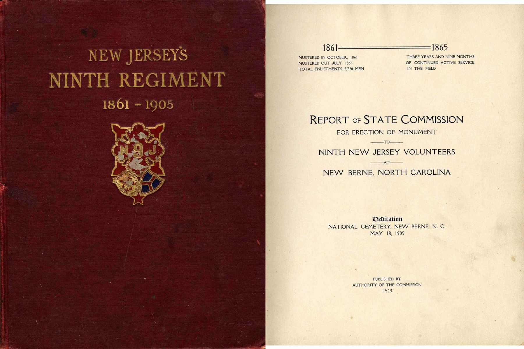 ''New Jersey's Ninth Regiment 1861-1905: Report of State Commission for Erection of Monument to Ninth New Jersey Volunteers at New Berne, North Carolina''. Philadelphia: John C. Winston Company: 1905. The 9th New Jersey fought in the Civil War Battle of New Berne and was stationed there again briefly in December 1864. Book, measuring 7.5'' x 10'', runs 112pp. Boards show wear and water damage; corners bumped. Some foxing and mild toning to interior. Overall good condition.