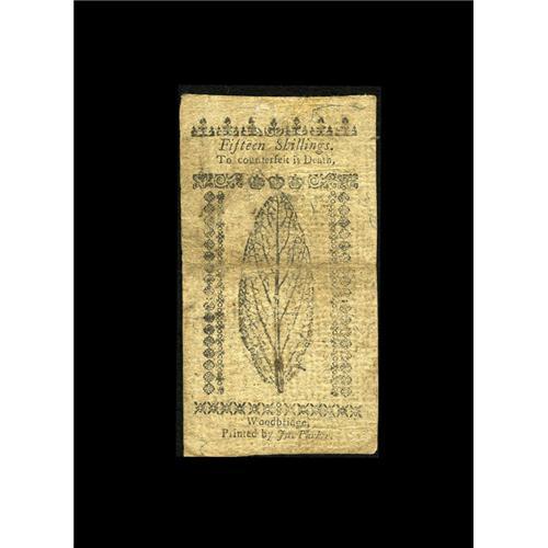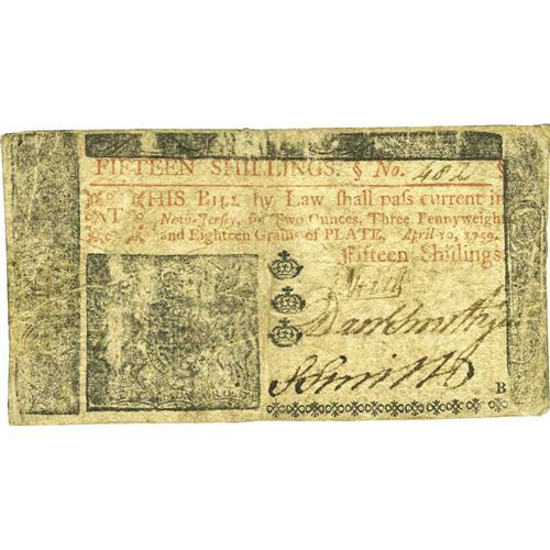 <B>New Jersey April 10, 1759 15s Very Fine.</B></I> A problem-free well-signed example of one of the scarcer New Jersey issues. This note is priced only in VG in the Friedberg reference with the VF column noting "rare." When notes from this issue are encountered, they are invariably heavily repaired with badly rounded corners and illegible areas. This piece has none of those problems and is likely one of the finest known examples of the denomination.<BR><I>Ex: John Ford</B></I>