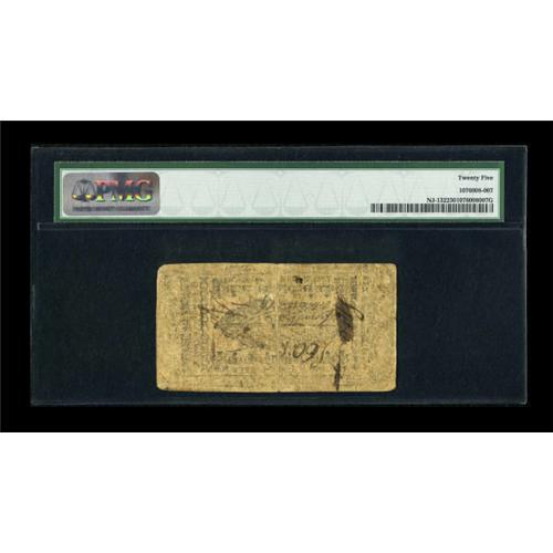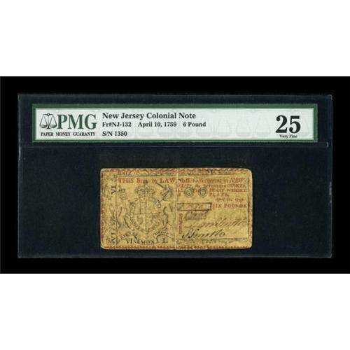 <B>New Jersey April 10, 1759 £6 PMG Very Fine 25.</B></I> The colors remain bright on this NJ Colonial with a heavy center fold.<BR><BR><b>Shipping:</b> Coins & Currency (<a target="_blank" href="http://www.heritageauctions.com/common/shipping.php">view shipping information</a>)
