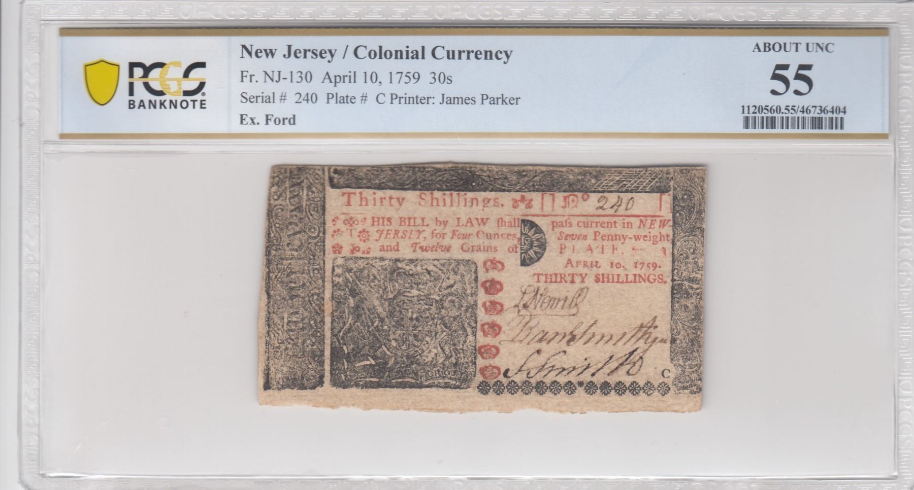 New-Jersey. April 10, 1759. Thirty Shillings. Fr. NJ-130. PCGS About Uncirculated-55. No qualifiers.