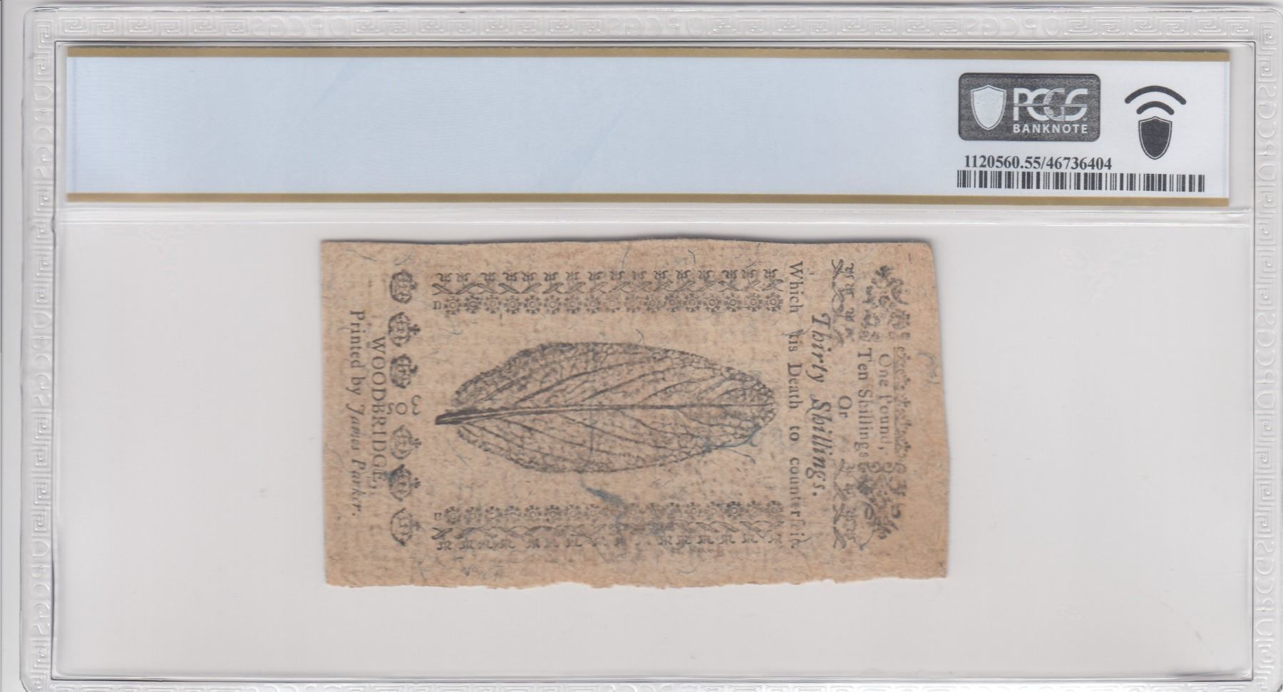 Description: Thick paper. Plate C; this denomination comes with plate positions A, B, C, and D. Serial No. 240. Signed by S. Neville, Dan. Smith, Jr., and S. Smith. Standard size. Two-Sided. Black and red ink face, black back. Printed by James Parker, Woodbridge. Which Tis Death To Counterfeit, another variation on the theme. An appealing note with every glance revealing another pleasing element. The inking is deep and well-suited to the warm golden paper. One of “those” notes that may just as well have been called New by PCGS; it is that fine! Destined to be a showpiece in a fine collection of colonial notes.