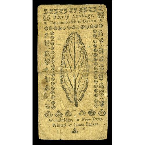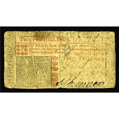 <B>New Jersey April 16, 1764 30s Fine.</B></I> Well circulated with rounded corners and tight margins, but a far nicer example than the tattered pieces that are usually seen from this issue. Only 5000 examples were originally printed.