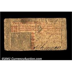 New Jersey April 16, 1764 30s Fine. Well circulated with rounded corners and tight margins, but a nicer example than the tattered pieces that are usually seen from this issue. Only 5000 examples were originally printed. Important notice: We expect to be auctioning lots at the rate of 200-250 per hour. Sometimes eBay Premier live bid software cannot keep up with that pace, so we strongly recommend that you place a realistic proxy bid now as insurance to avoid disappointment. Also please note that all Heritage/CAA lots purchased through eBay Premier carry a 20% Buyer's Premium. Please make sure you read the Terms and Conditions.