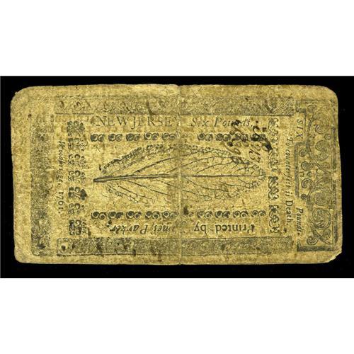 <B>New Jersey April 23, 1761 L6 Fine-Very Fine.</B></I> The colors are pleasing on this example which is scarcer in higher grades. All four corners are rounded with a heavy center fold.