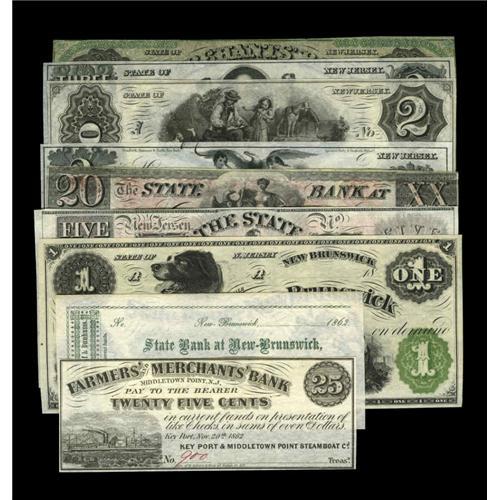 <B>New Jersey Collection.</B></I><BR><B>Middletown, NJ- Key Port & Middletown Point Steamboat Co.</B></I> 25¢ Nov. 20, 1862 Wait 1026 <B>XF</B></I><BR><B>New Brunswick, NJ- Hagaman, Van Cleef & Dunhams</B></I> 25¢ 1862 Wait 1675 <B>AU+</B></I><BR><B>New Brunswick, NJ- State Bank of New Jersey</B></I> $1, $5, $20 18__ G14a Wait 1682, G52c Wait 1702, G68c Wait 1714 <B>AU or Better</B></I><BR><B>Newton, NJ- Sussex Bank</B></I> $2, $2, $3 18__ G18 Wait 1750, G20a Wait 1749, G28 Wait 1756 <B>Choice CU</B></I><BR><B>Trenton, NJ- Merchants' Bank</B></I> $1 Nov. 20, 1861 G2a Wait 2342 <B>VF.</B></I>