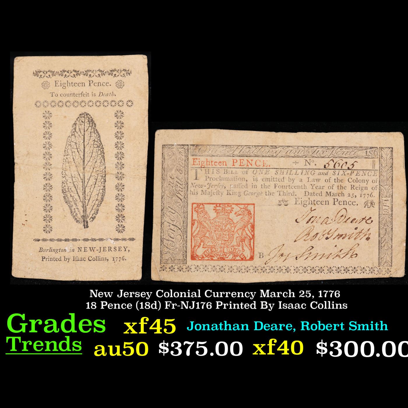 New Jersey Colonial Currency March 25, 1776 18 Pence (18d) Fr-NJ176 Printed By Isaac Collins Grades xf+.