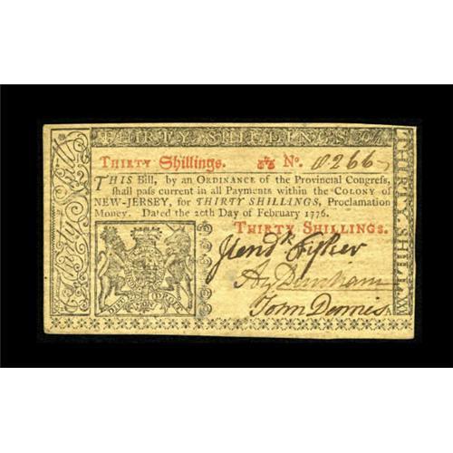 <B>New Jersey February 20, 1776 30s Choice New.</B></I> Three dark signatures, precise printing, and dark inks adorn this note. A light moisture spot is noticed at back center.<BR><BR><b>Shipping:</b> Coins & Currency (<a target="_blank" href="http://www.heritageauctions.com/common/shipping.php">view shipping information</a>)