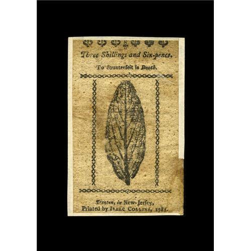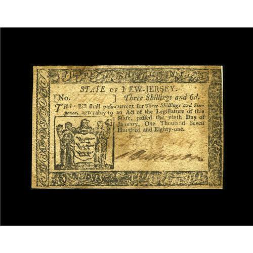 <B>New Jersey January 9, 1781 3s/6d Very Fine.</B></I> While decently margined on the front, the back has been reinforced along the edges on this much scarcer late-date issue. Light staining is also noted.<BR><BR><b>Shipping:</b> Coin/Currency (<a target="_blank" href="http://www.heritageauctions.com/common/shipping.php">view shipping information</a>)