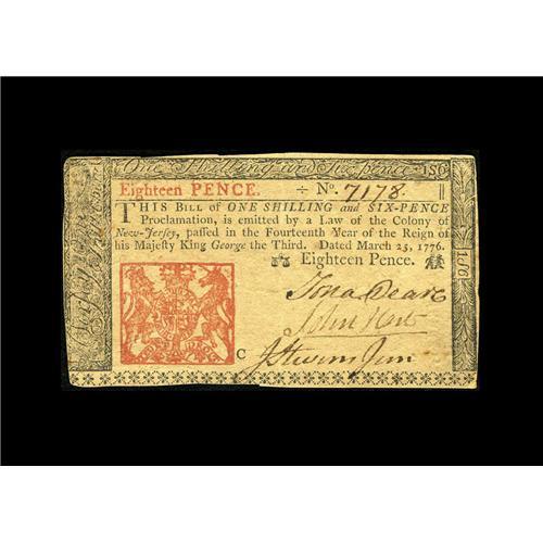 <B>New Jersey March 25, 1776 18d Extremely Fine.</B></I> The second signer on this note is John Hart, who also signed the Declaration of Independence. This is a tougher issue to locate.<BR><BR><b>Shipping:</b> Coin/Currency (<a target="_blank" href="http://www.heritageauctions.com/common/shipping.php">view shipping information</a>)