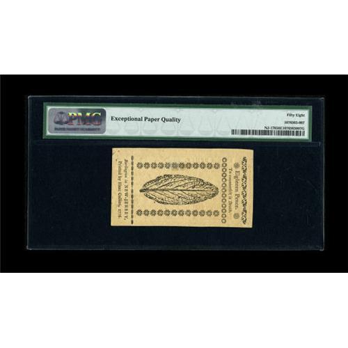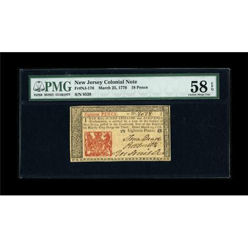 <B>New Jersey March 25, 1776 18d PMG Choice About Unc 58 EPQ.</B></I> A soft fold is noticed on this otherwise Gem NJ issue.<BR><BR><b>Shipping:</b> Coins & Currency (<a target="_blank" href="http://www.heritageauctions.com/common/shipping.php">view shipping information</a>)