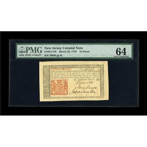 <B>New Jersey March 25, 1776 18d PMG Choice Uncirculated 64.</B></I> A jumbo-margined, flawless example with razor sharp print quality on both sides. Even the red New Jersey coat of arms is sharply printed, allowing every letter of every word to be clearly seen. The signatures are strong.<BR><BR><b>Shipping:</b> Coins & Currency (<a target="_blank" href="http://www.heritageauctions.com/common/shipping.php">view shipping information</a>)