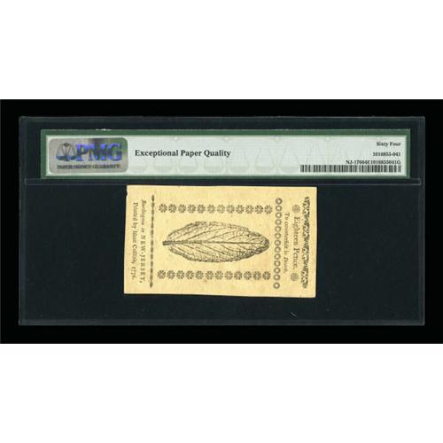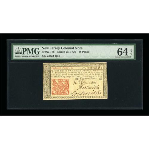 <B>New Jersey March 25, 1776 18d PMG Choice Uncirculated 64 EPQ.</B></I> The margins are full on three sides and the red printed details remain bold.<BR><BR><b>Shipping:</b> Coins & Currency (<a target="_blank" href="http://www.heritageauctions.com/common/shipping.php">view shipping information</a>)