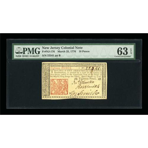 <B>New Jersey March 25, 1776 18d PMG Choice Uncirculated 63 EPQ.</B></I> Gem quality margins and bold color complement the original paper quality.<BR><BR><b>Shipping:</b> Coins & Currency (<a target="_blank" href="http://www.heritageauctions.com/common/shipping.php">view shipping information</a>)