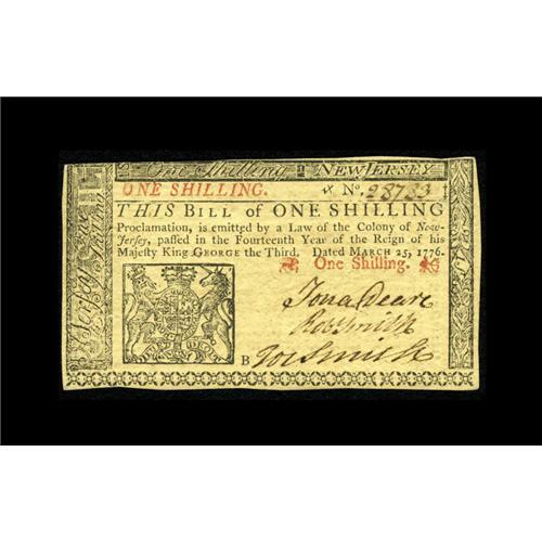 <B>New Jersey March 25, 1776 1s Choice New.</B></I> Cut-in slightly at the top, but with all the other attributes of a Gem. <BR><I>From The Collection of Louis E. Eliasberg, Sr.</B></I><BR><BR><b>Shipping:</b> Coin/Currency (<a target="_blank" href="http://www.heritageauctions.com/common/shipping.php">view shipping information</a>)