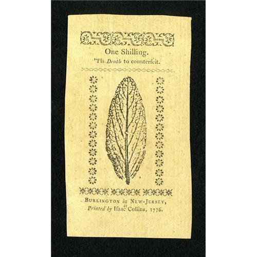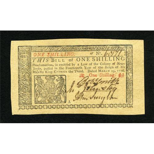 <B>New Jersey March 25, 1776 1s Extremely Fine.</B></I> This is an interesting note in that usually for this issue the serial numbering and one signature is done in red ink. This example is an all black ink penmanship affair.<BR><BR><b>Shipping:</b> Coins & Currency (<a target="_blank" href="http://www.heritageauctions.com/common/shipping.php">view shipping information</a>)