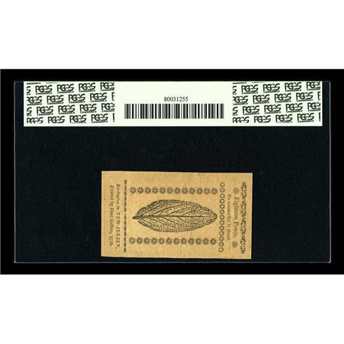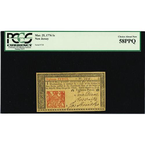 <B>New Jersey March 25, 1776 1s PCGS Choice About New 58PPQ.</B></I> This is the type of note that realizes much more than the typical note for the grade as it is a single faint fold from a four figure superb Gem note. The margins are utterly gigantic with excellent print quality and bold signatures.