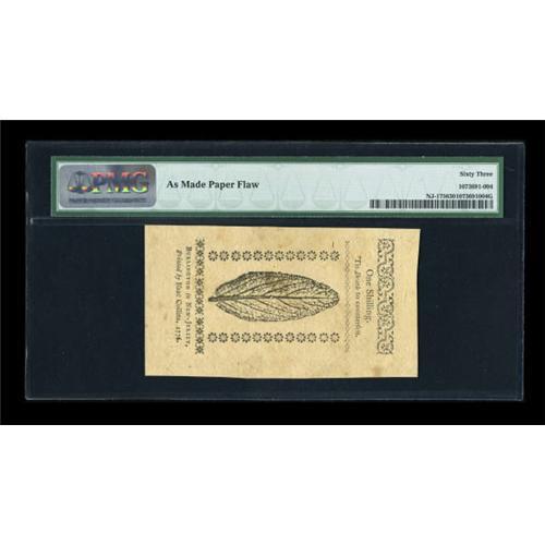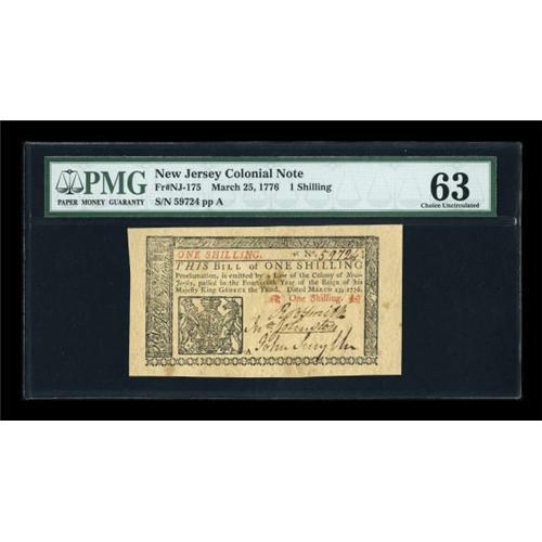 <B>New Jersey March 25, 1776 1s PMG Choice Uncirculated 63.</B></I> PMG has noted an "As Made Paper Flaw", and they are indeed correct. Save for that, this wide margin Jersey note is original and highly attractive. <BR><BR><b>Shipping:</b> Coins & Currency (<a target="_blank" href="http://www.heritageauctions.com/common/shipping.php">view shipping information</a>)
