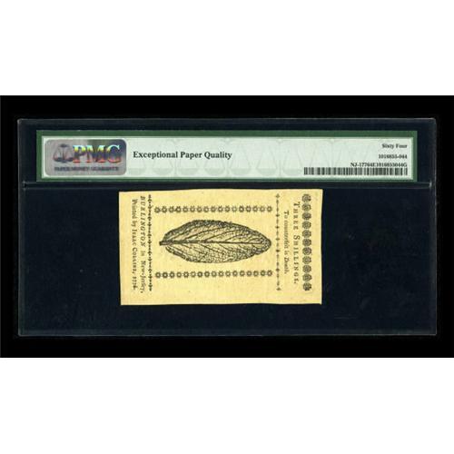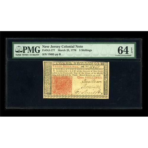 <B>New Jersey March 25, 1776 3s PMG Choice Uncirculated 64 EPQ.</B></I> A tight margin on top keeps this pleasing piece from a Gem grade.<BR><BR><b>Shipping:</b> Coins & Currency (<a target="_blank" href="http://www.heritageauctions.com/common/shipping.php">view shipping information</a>)