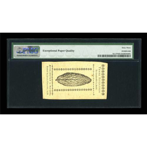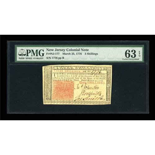 <B>New Jersey March 25, 1776 3s PMG Choice Uncirculated 63 EPQ.</B></I> A deep red overprint contrasts with the original paper.<BR><BR><b>Shipping:</b> Coins & Currency (<a target="_blank" href="http://www.heritageauctions.com/common/shipping.php">view shipping information</a>)