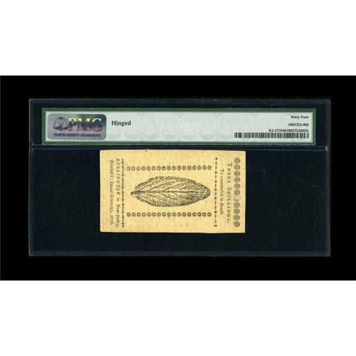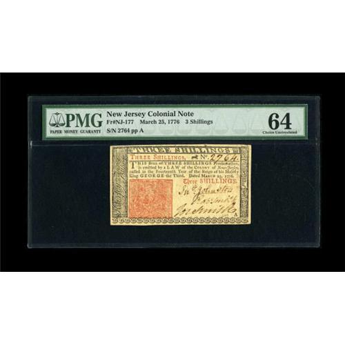 <B>New Jersey March 25, 1776 3s PMG Choice Uncirculated 64.</B></I> PMG has commented "Hinged" as being a flaw on this well margined example.<BR><BR><b>Shipping:</b> Coins & Currency (<a target="_blank" href="http://www.heritageauctions.com/common/shipping.php">view shipping information</a>)