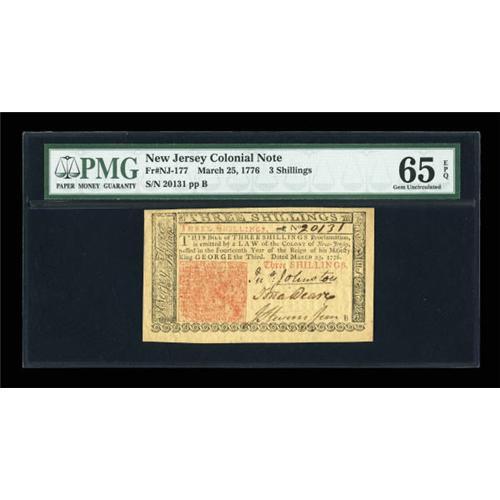 <B>New Jersey March 25, 1776 3s PMG Gem Uncirculated 65 EPQ.</B></I> Solid margins frame this original and fully uncirculated Gem.<BR><BR><b>Shipping:</b> Coins & Currency (<a target="_blank" href="http://www.heritageauctions.com/common/shipping.php">view shipping information</a>)