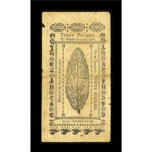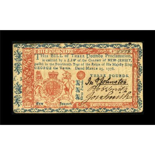 <B>New Jersey March 25, 1776 £3 Extremely Fine.</B></I> A lightly circulated example of this New Jersey Tricolor issue displaying a heavy center fold. The red New Jersey state arms are particularly sharply printed, showing all the features of the unicorn, lion, coat of arms and crown. An affordable example of an extremely popular note.<BR><BR><b>Shipping:</b> Coins & Currency (<a target="_blank" href="http://www.heritageauctions.com/common/shipping.php">view shipping information</a>)