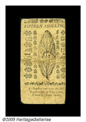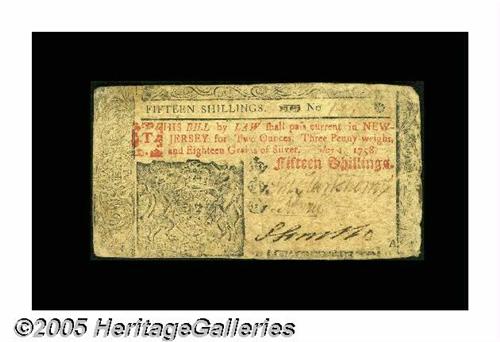 <B>New Jersey May 1, 1758 15s Very Fine.</B></I> Incredible grade for the issue, with good signatures, excellent printing quality and no problems of any kind save for very slightly rounded corners at the right. We've handled twelve notes from this issue, but all twelve have been from the three highest denominations. Seven of the twelve were L6 notes. This is the first 15s we've handled. An important early Jersey that's sure to attract considerable bidder attention.