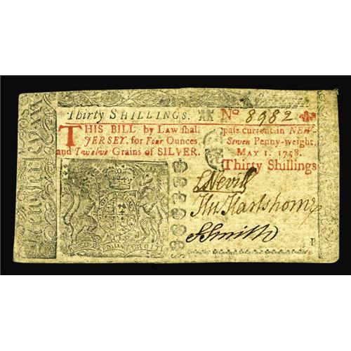 New Jersey May 1, 1758 30s Extremely Fine. This colorfu New Jersey May 1, 1758 30s Extremely Fine.
