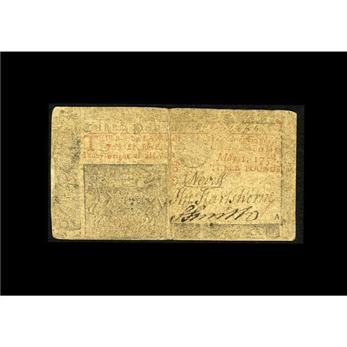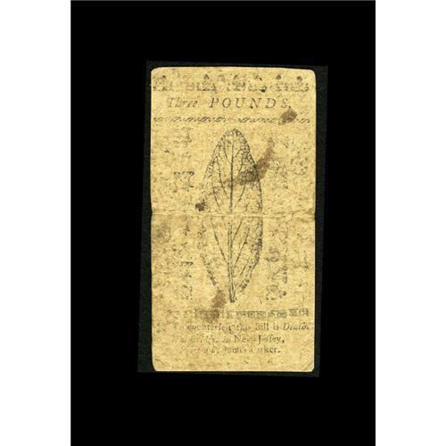 <B>New Jersey May 1, 1758 L3 Very Fine.</B></I> This is a splendid example from this much scarcer early New Jersey issue from which notes are usually found in the VG grade range or lower. This example, while printed a little weakly at the top, has three bold signatures and clear designs on both the face and back. Most low grade examples from this issue are plagued by multiple tears, pinholes and the like, while this note has no such problems.