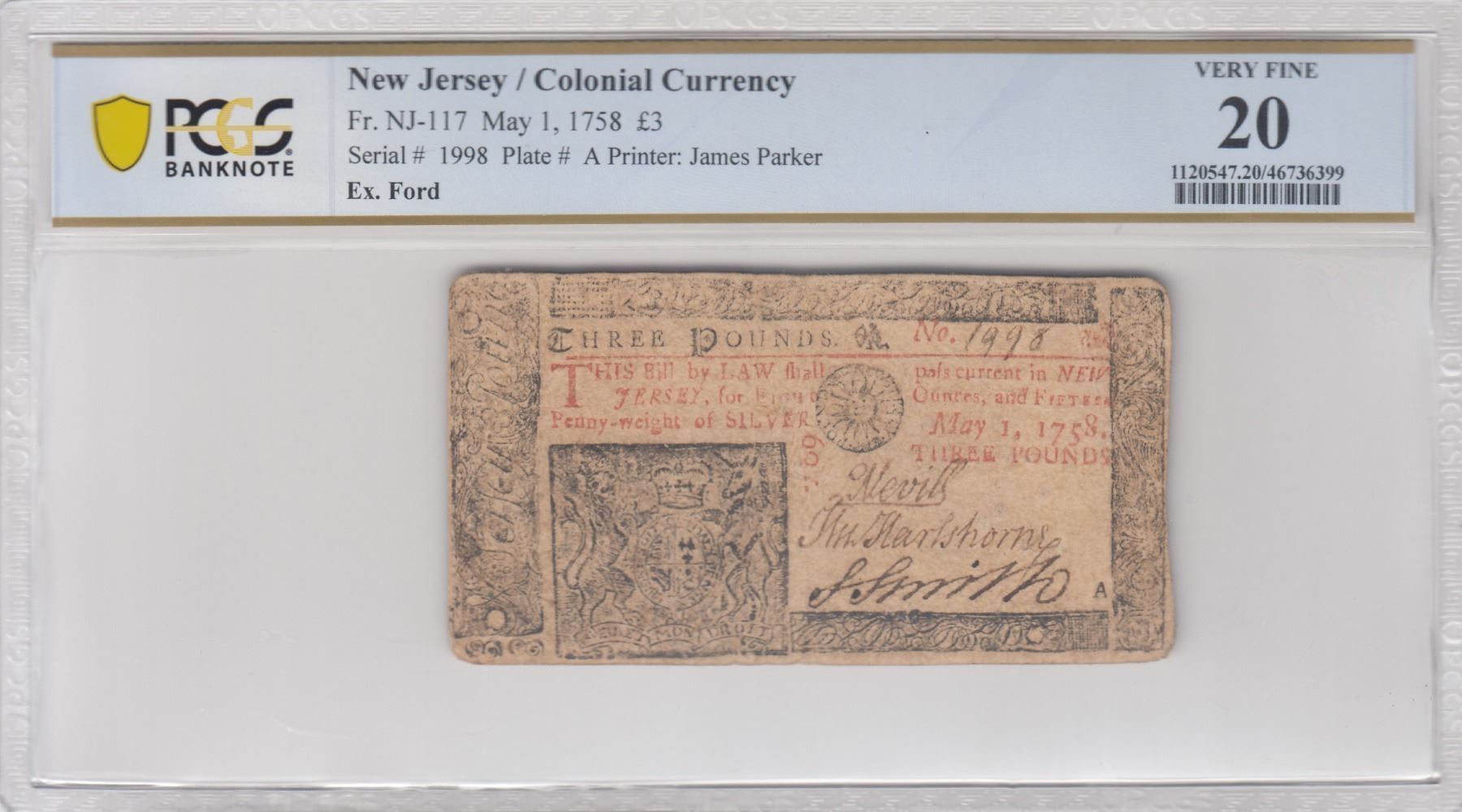 New-Jersey. May 1, 1758. Three Pounds. Fr. NJ-117. PCGS Very Fine-20. No qualifiers. As illustrated.