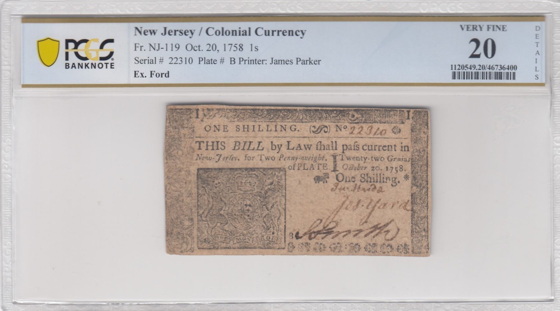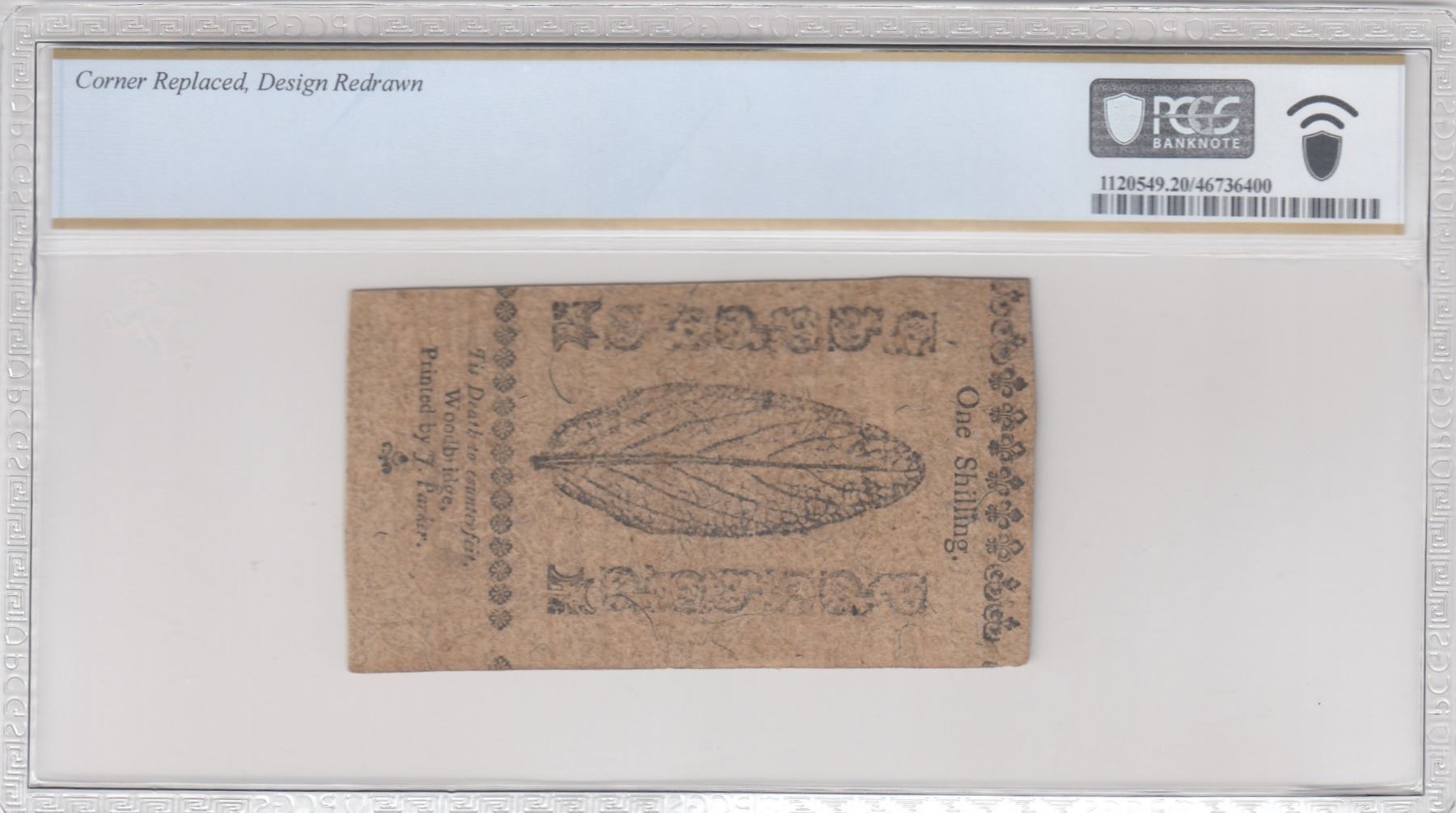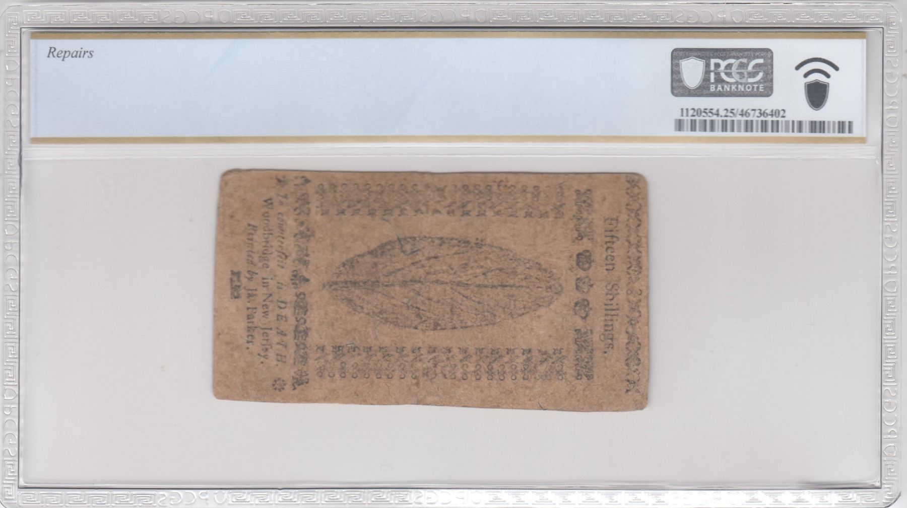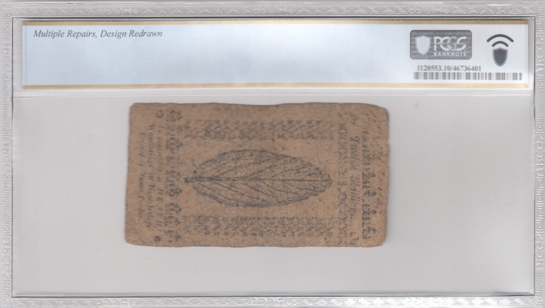 Description: Includes: One Shilling. Fr. NJ-119. PCGS Very Fine-20 Details. Corner Replaced, Design Redrawn. Serial No. 22310. Plate B; Six Shillings. Fr. NJ-122. PCGS Very Fine-30 Details. Small Piece Replaced. Serial No. 8857. Plate A; Twelve Shillings. Fr. NJ-123. PCGS Very Good-10 Details. Multiple Repairs, Design Redrawn. Serial No. 15043. Plate A; and Fifteen Shillings. Fr. NJ-124. PCGS Very Fine-25 Details. Repairs. Serial No. 2445. Plate B. All notes are standard size, in black ink, two-sided, and the product of James Parker of Woodbridge, New Jersey. (Total: 4 pieces)