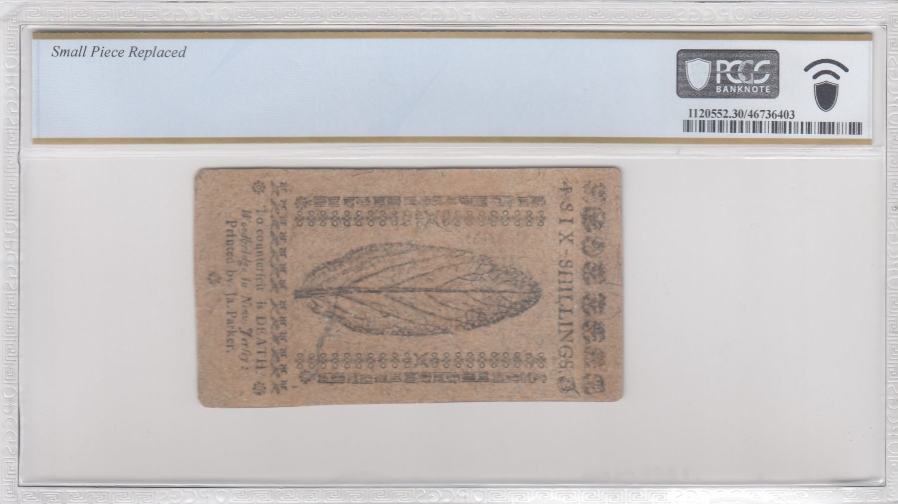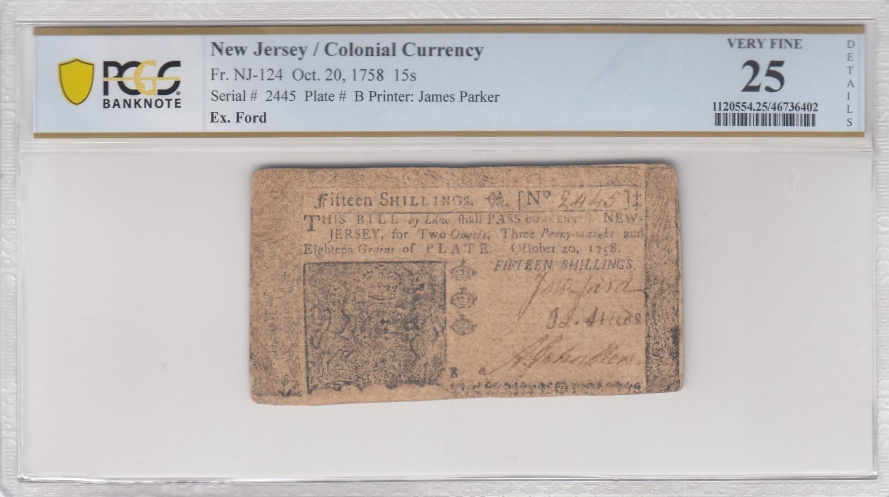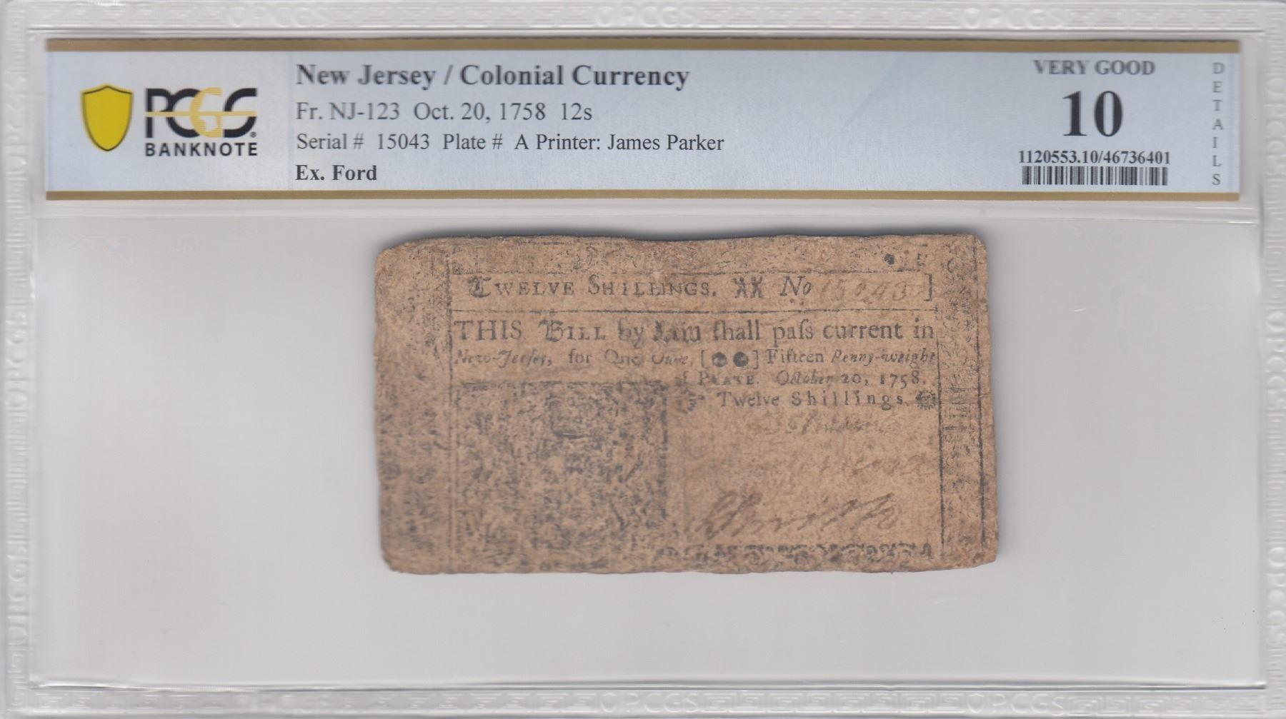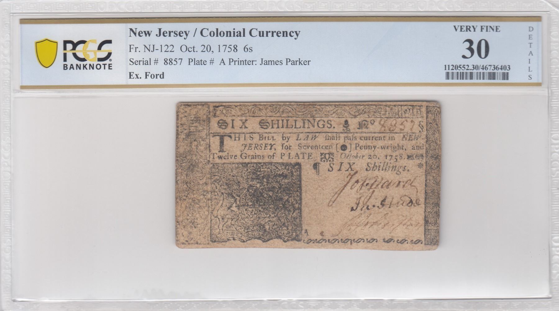 Description: Includes: One Shilling. Fr. NJ-119. PCGS Very Fine-20 Details. Corner Replaced, Design Redrawn. Serial No. 22310. Plate B; Six Shillings. Fr. NJ-122. PCGS Very Fine-30 Details. Small Piece Replaced. Serial No. 8857. Plate A; Twelve Shillings. Fr. NJ-123. PCGS Very Good-10 Details. Multiple Repairs, Design Redrawn. Serial No. 15043. Plate A; and Fifteen Shillings. Fr. NJ-124. PCGS Very Fine-25 Details. Repairs. Serial No. 2445. Plate B. All notes are standard size, in black ink, two-sided, and the product of James Parker of Woodbridge, New Jersey. (Total: 4 pieces)