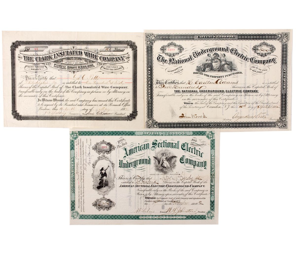A set of 3 certificates from different companies all issued in 1882 and incorporated in New Jersey. 1) American Sectional Electric Underground Company, issued 1882 to Mary McCurdy for 200 shares at $5 each. Signed by W.H. Johnstone as president and (?) Sabine as treasurer. Female holding lightning bolt. Uncancelled. EF. 2) The National Underground Electric Company, issued 1882 to H. Carlton Adams for 500 shares at $5 each. Signed by Augustus (illeg) as president and John Wood Jr. as secretary. New Jersey state seal. Some ink smear on penwork. Uncancelled.VF. 3) The Clark Insulated Wire Company, issued 1882 to Geo. C. Potts for 160 shares at $25 each. Signed by Louis C. Leman as president and J.W. Spalding as treasurer. Uncancelled. EF. A neat group. -61732