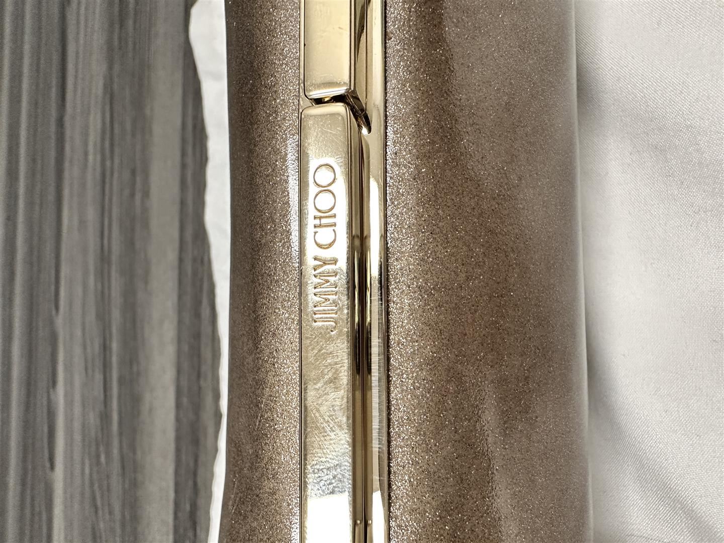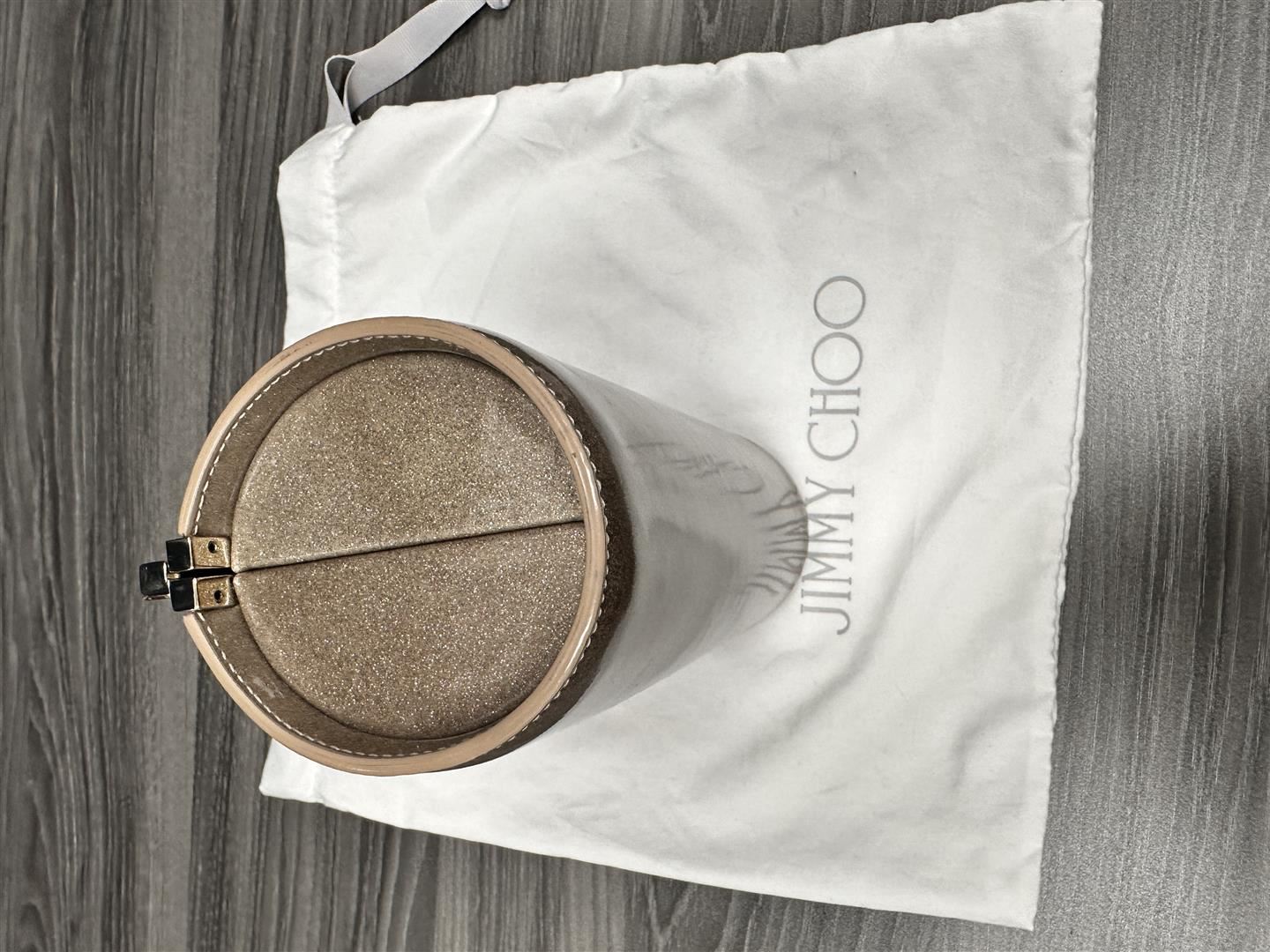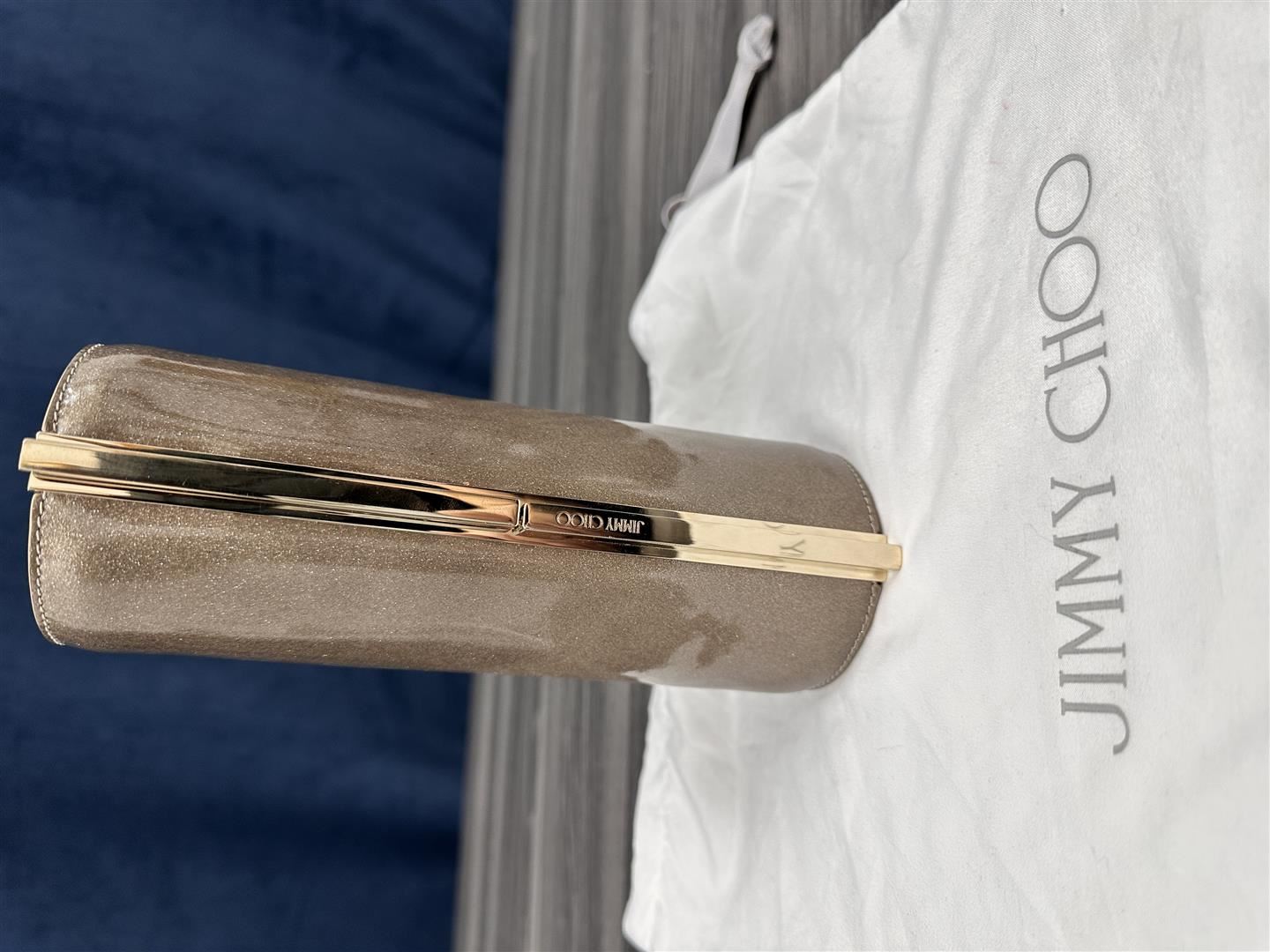 One New Jimmy Choo Glitter Patent Trinket Clutch.
