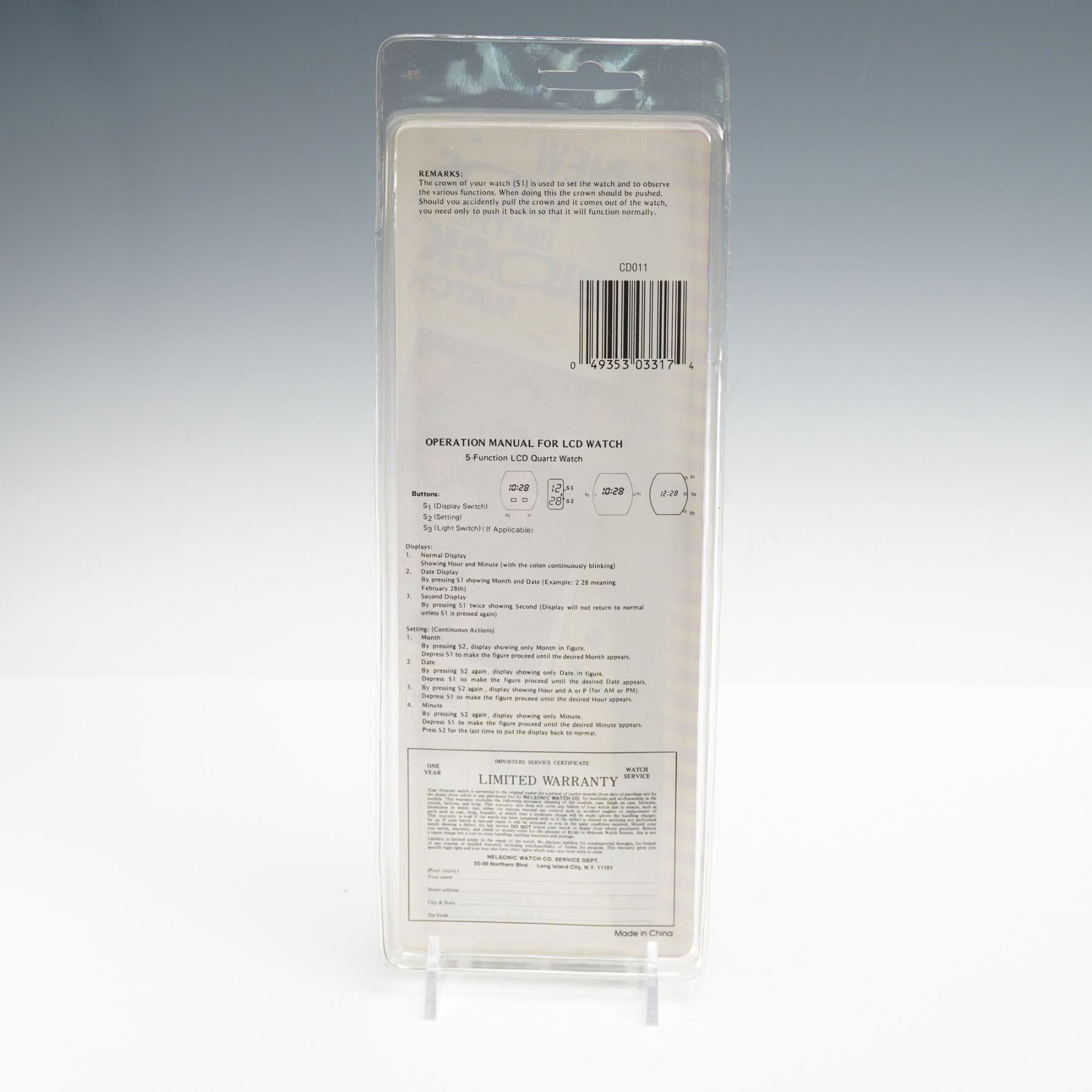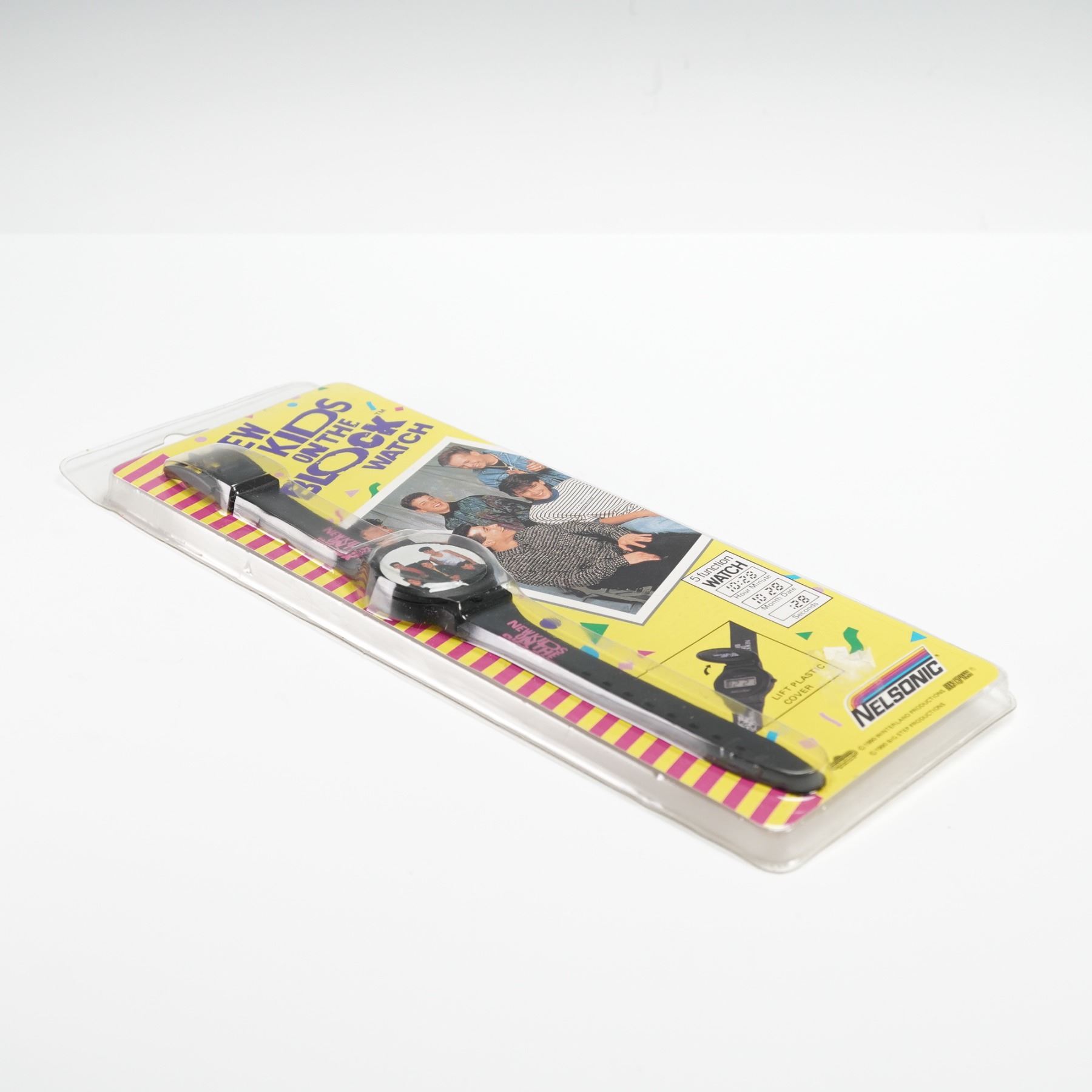This New Kids on the Block Watch is a 5-function LCD quartz watch in pink and black. It features a vibrant design with the iconic boy band on the face, offering a nostalgic piece for collectors and fans. The watch functions include hour, minute, second, month date, and second time zone display. Produced by Nelsonic in the 1990s, it showcases the bold color combination and style of the era. This item has its original box.