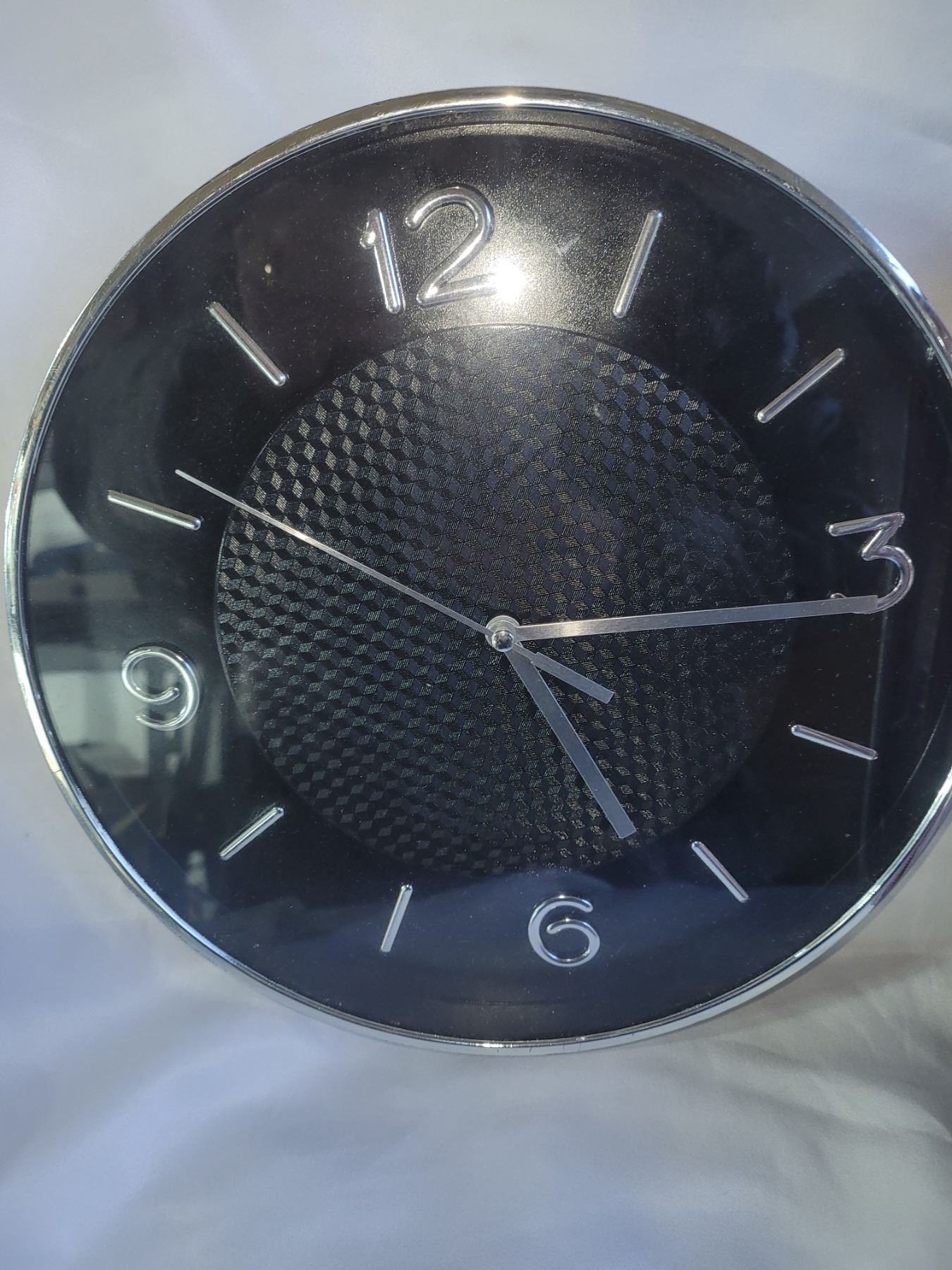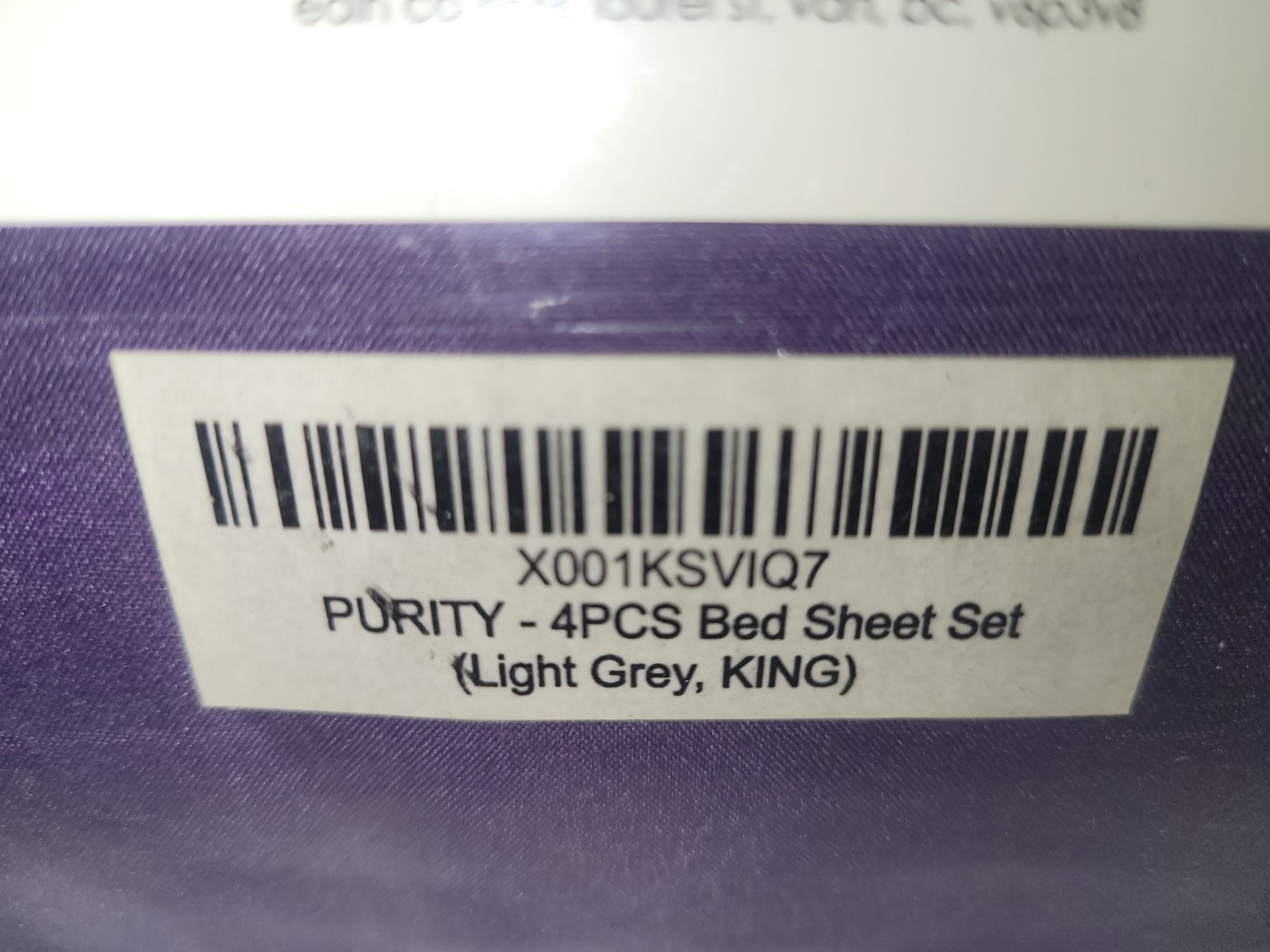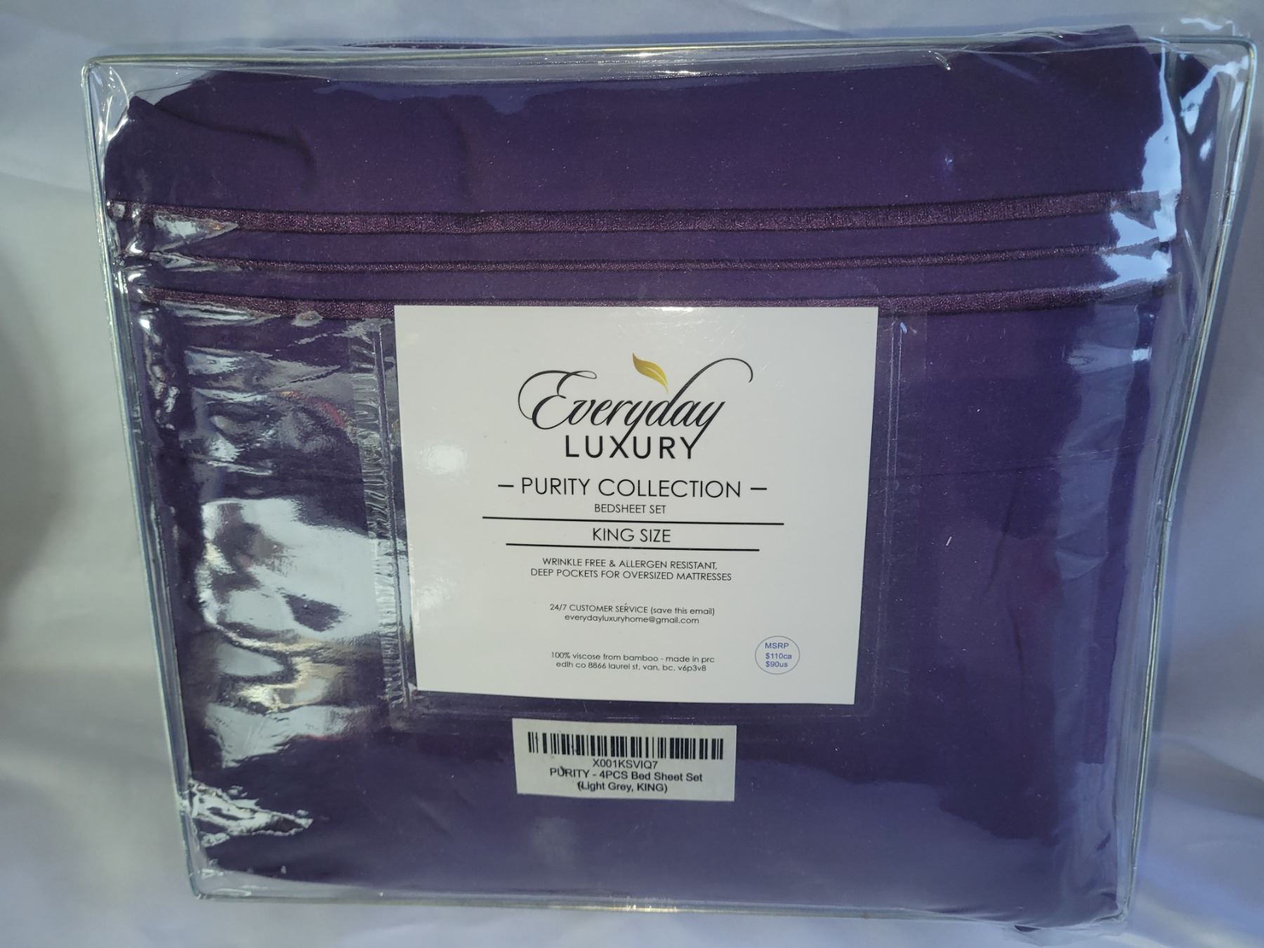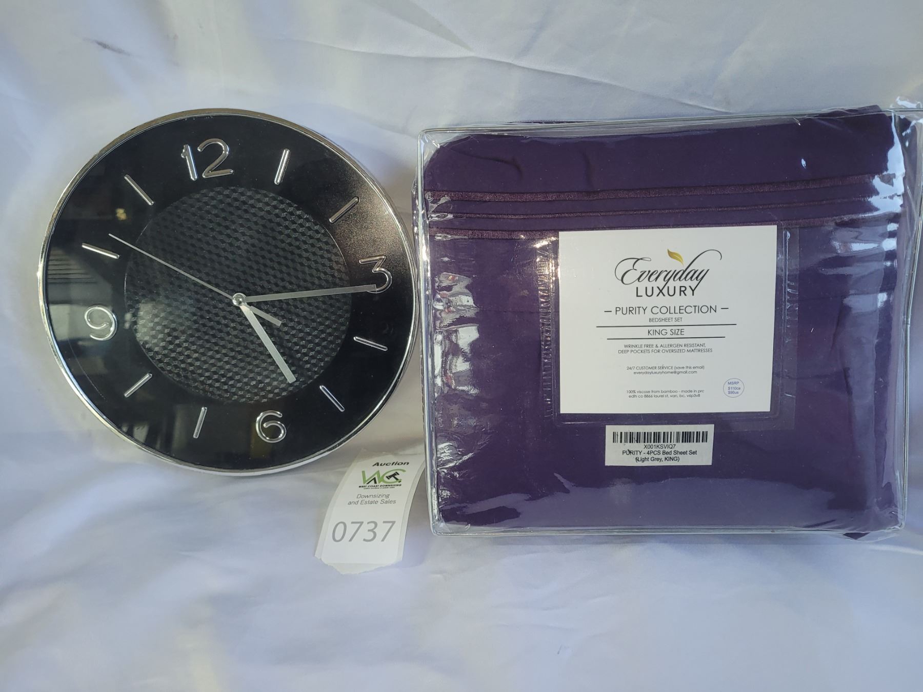 4 pce bed sheet set for King Size, colour purple. Battery wall clock. Pickup at 9 am