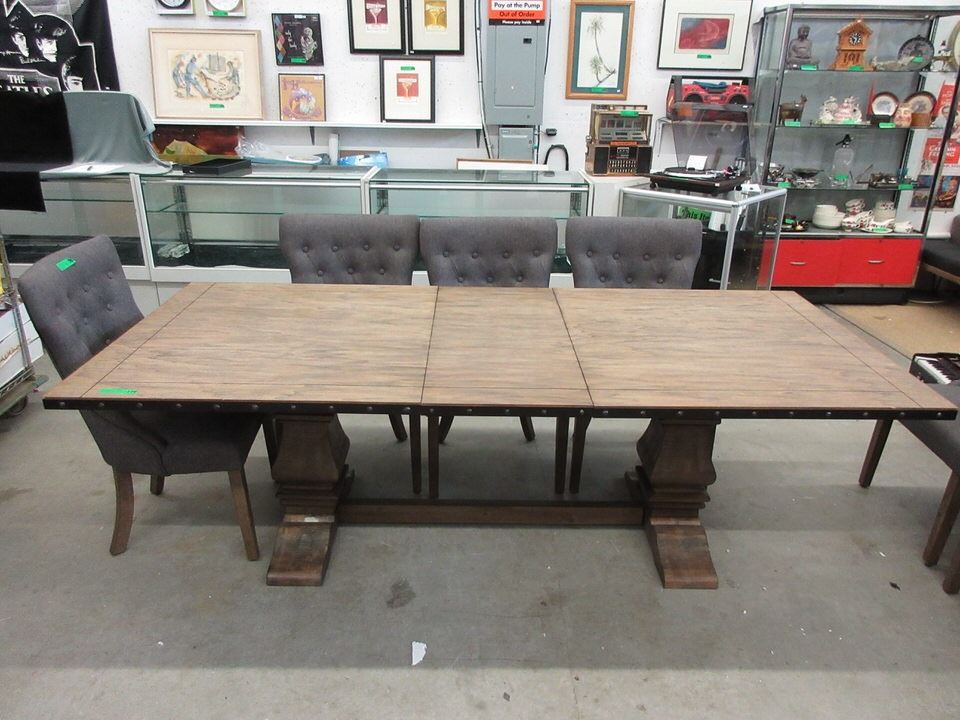 Trestle base. Nail head detail around the edge. Surface is 42" wide x 96" long with leaf