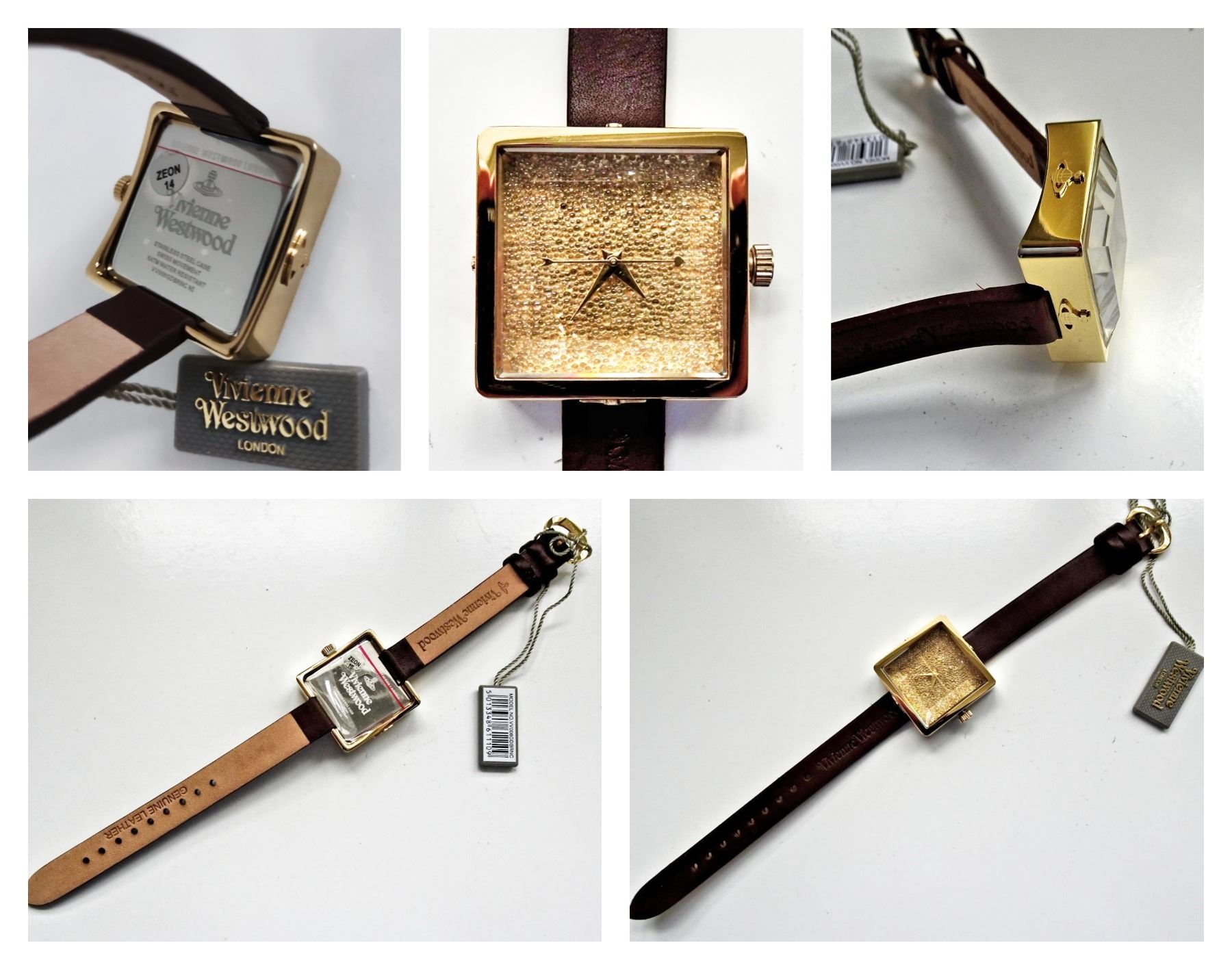 with tags. Gold plated all stainless steel case with gold Vivienne Westwood "Orbs" on the case sides and a dark brown Vivienne Westwood branded leather strap that has a gold stainless steel Vivienne Westwood branded buckle. The case size is 30mm x 30mm excluding the crown. Gold "sparkly" dial with gold hands. Water resistant to 50 metres (5ATM/BAR). Top quality Swiss made Ronda quartz movement.