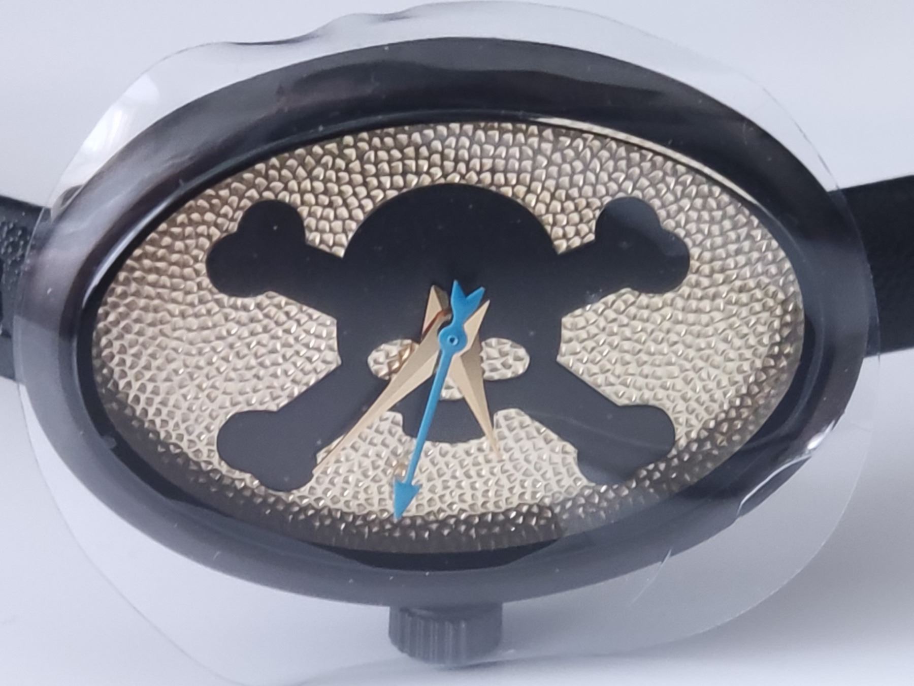 Gold textured dial with gold hour/minute hands, blue second hand and a black skull & crossbones across the dial.