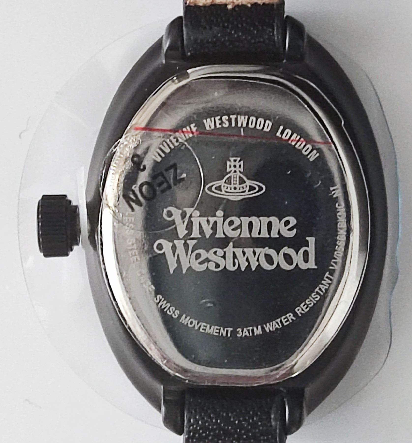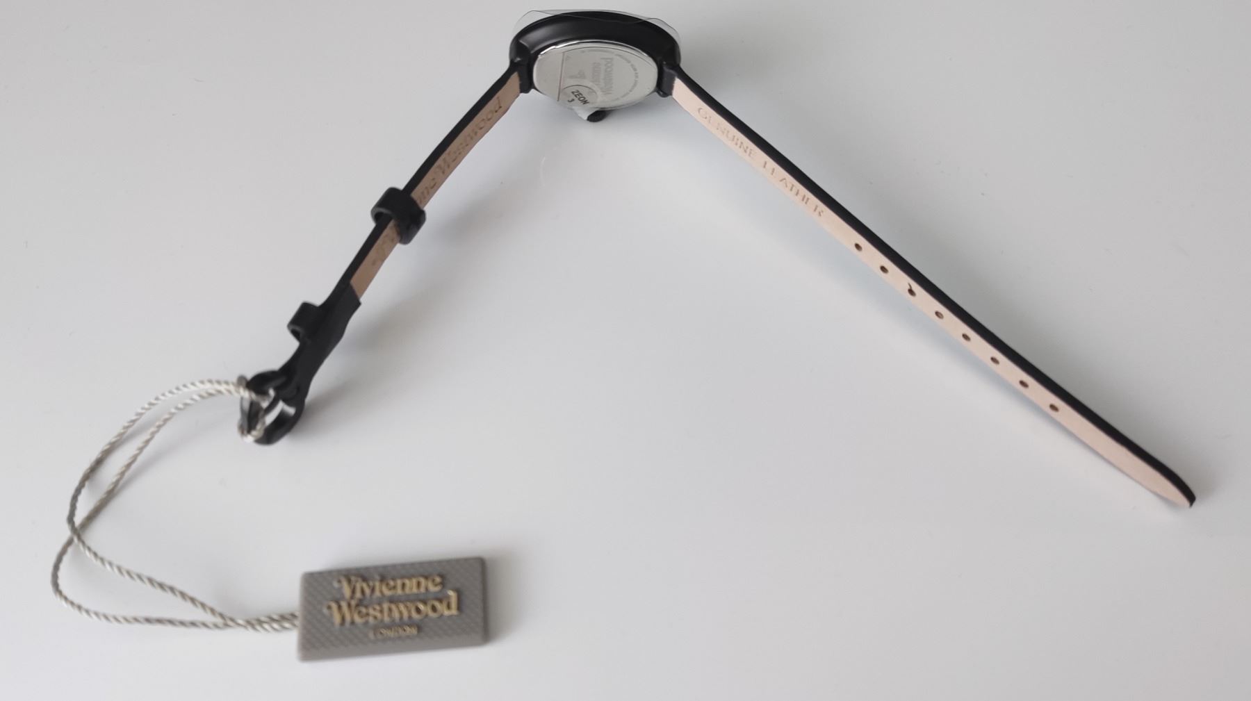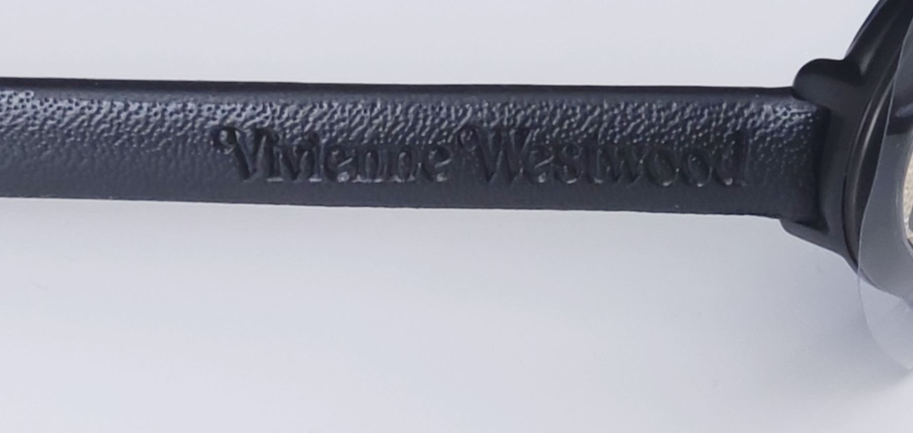 Black Ip coated all stainless steel case with a black Vivienne Westwood branded leather strap that has a black Ip coated stainless steel Vivienne Westwood branded buckle.