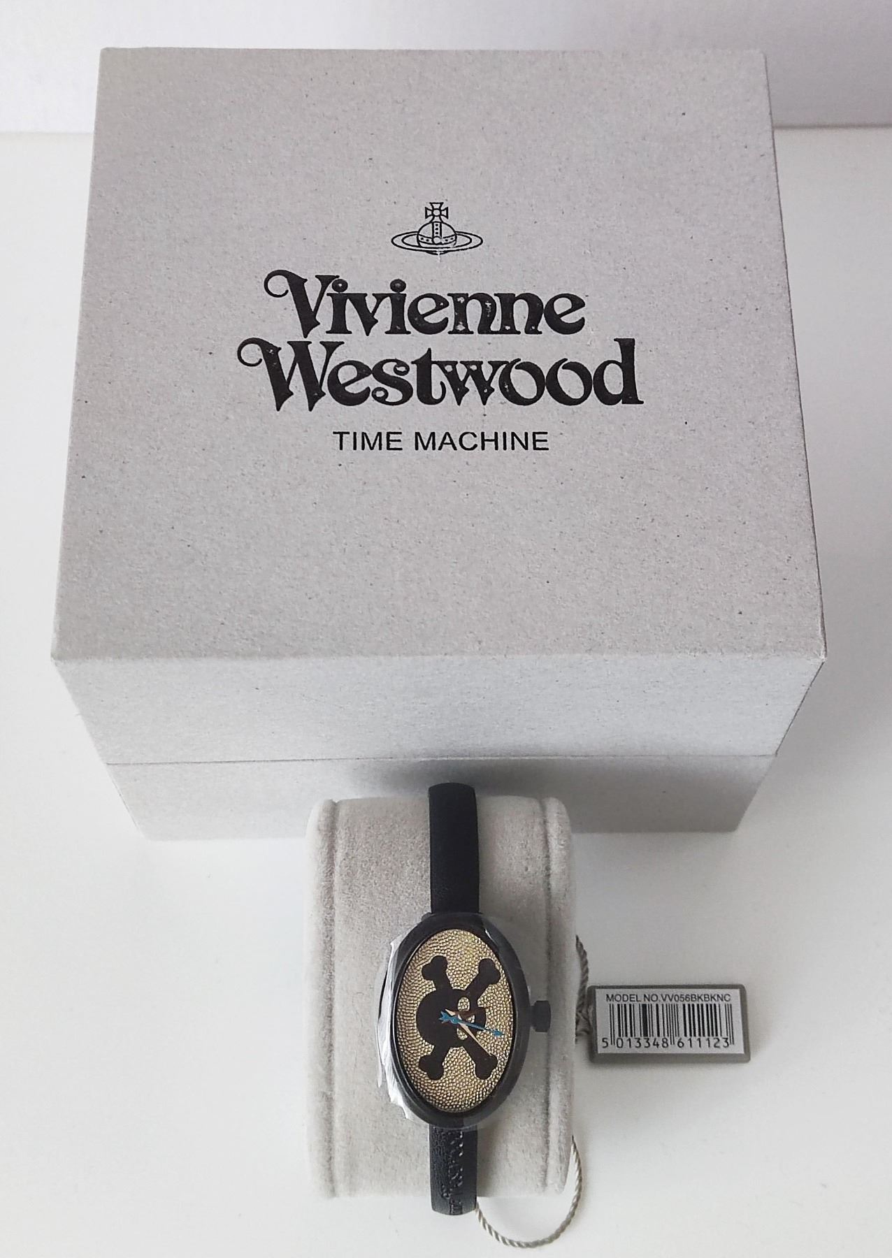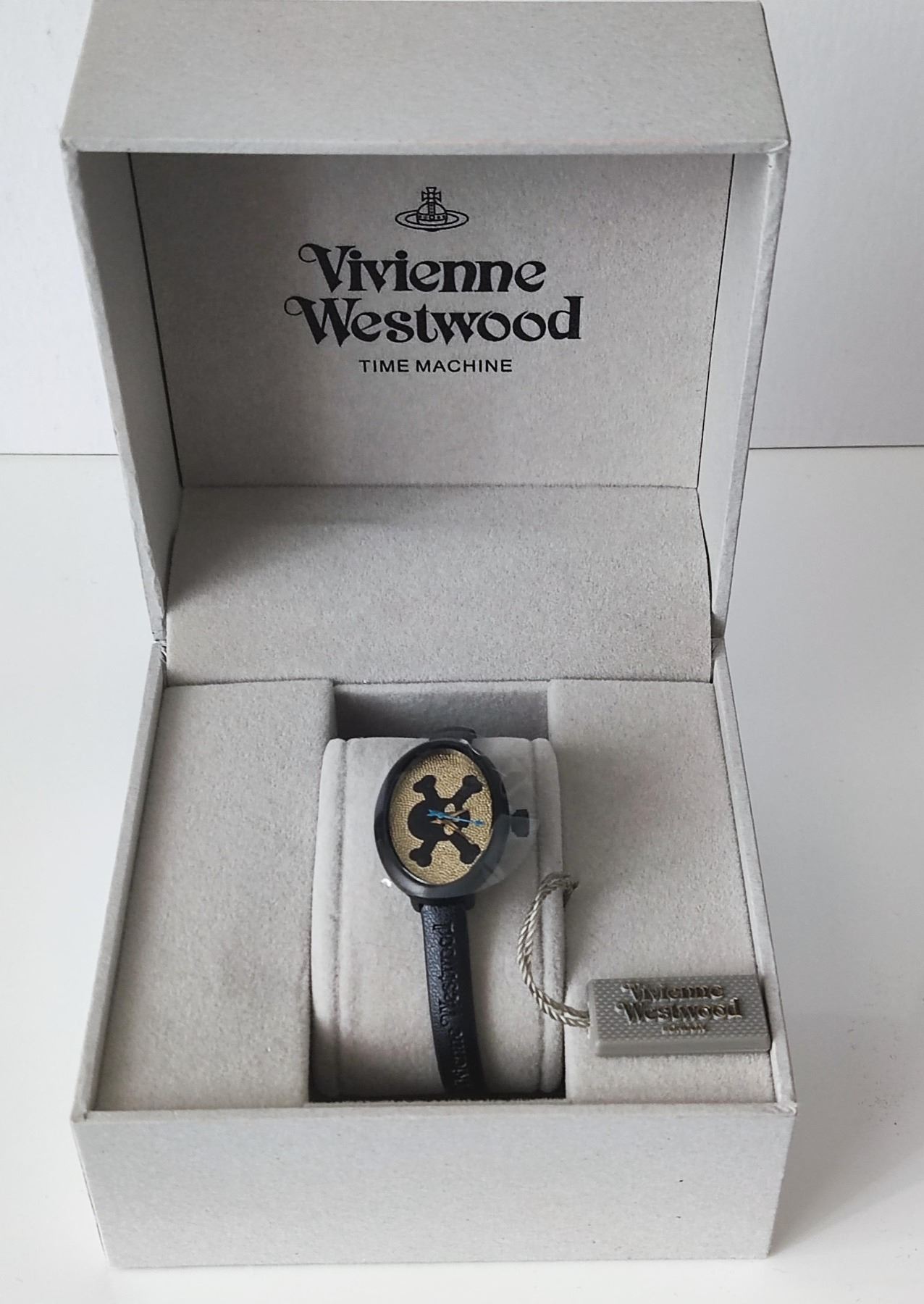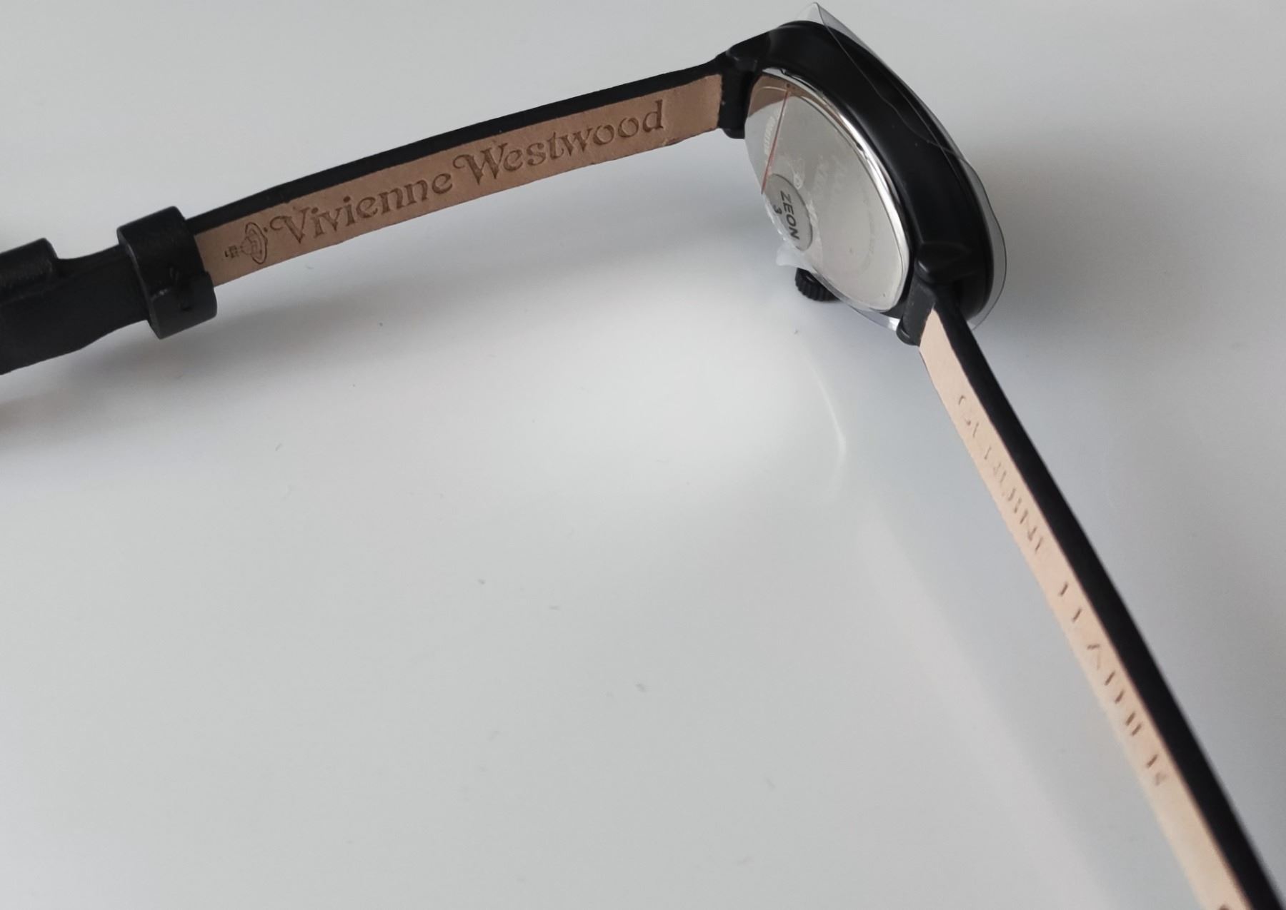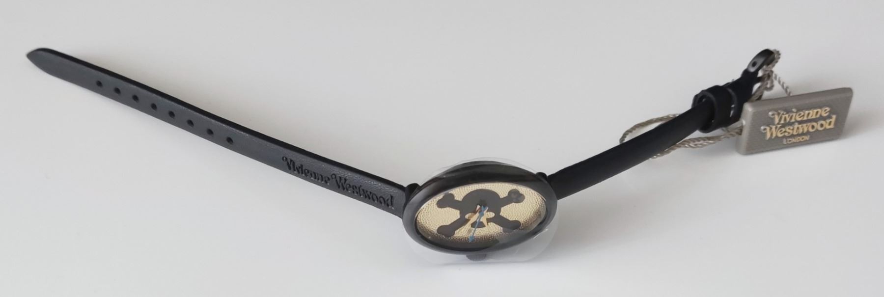 Black Ip coated all stainless steel case with a black Vivienne Westwood branded leather strap that has a black Ip coated stainless steel Vivienne Westwood branded buckle.