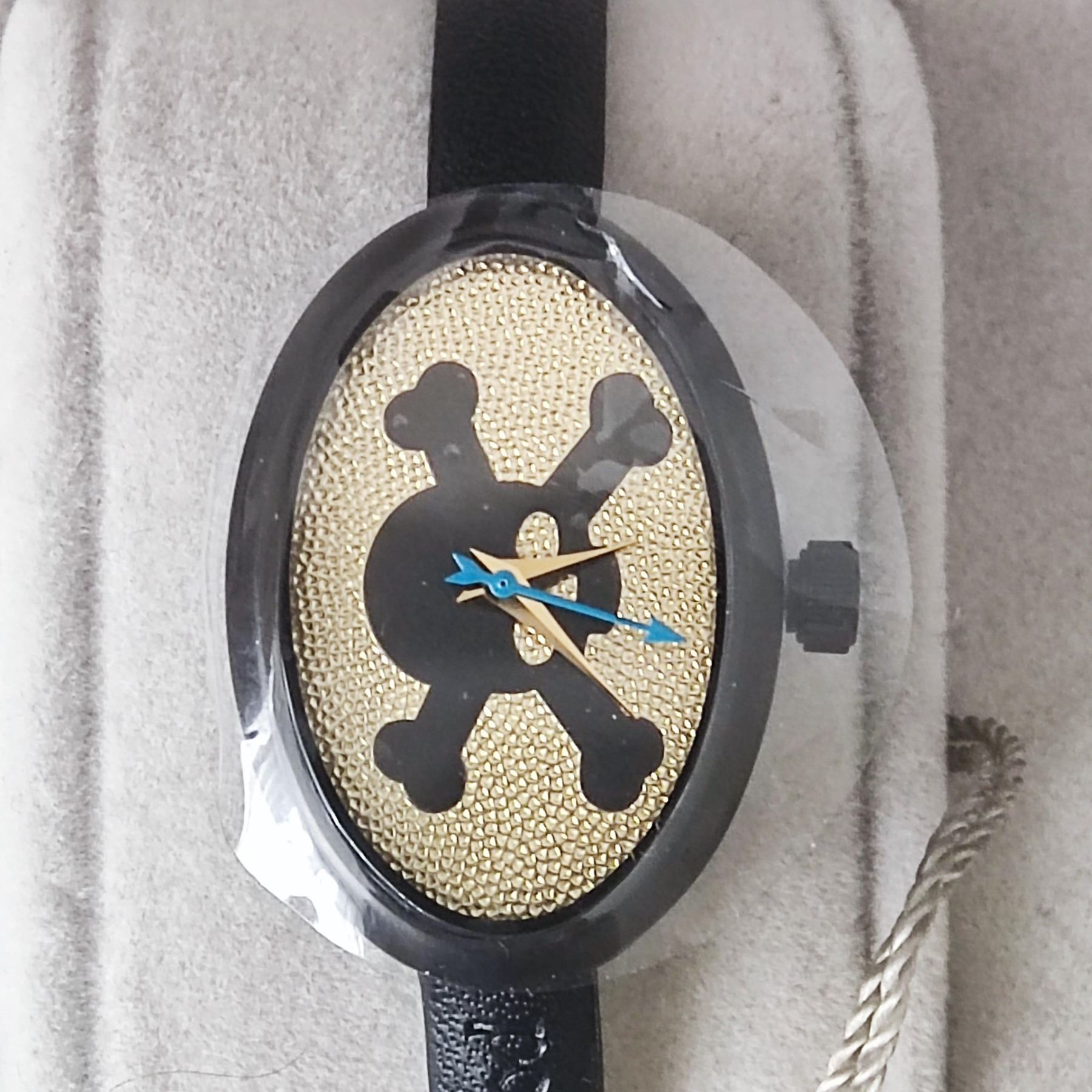 Gold textured dial with gold hour/minute hands, blue second hand and a black skull & crossbones across the dial.