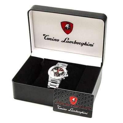 Brand New Tonino Lamborghini men's stylish sport CHRONOGRAPH style shaped watch in excellent new condition with date; half hour dial; seconds dial as well as 24-hour dial; stainless case and band; box and papers; retail $2995