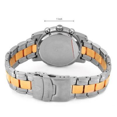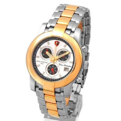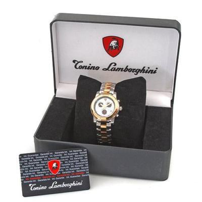Brand New Tonino Lamborghini men's stylish sport CHRONOGRAPH style shaped watch in excellent new condition with date; half hour dial; seconds dial as well as 24-hour dial; stainless/18k case and band; box and papers; retail $3595