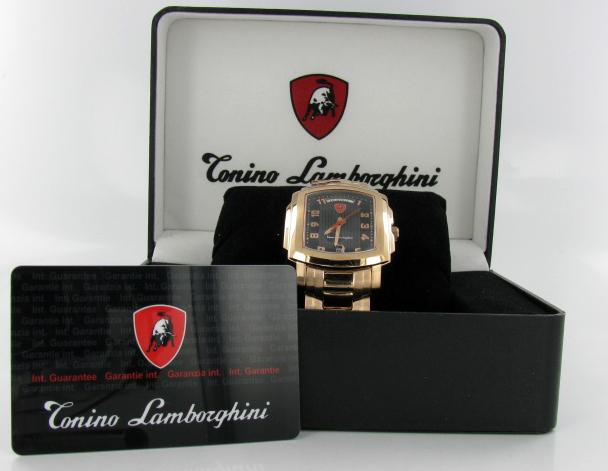 Brand New Tonino Lamborghini men's stylish sport Deco style tank shaped watch in excellent new condition; with date dial; 18k clad stainless case and band; box and papers; retail $2795