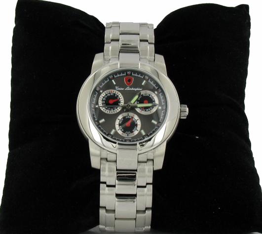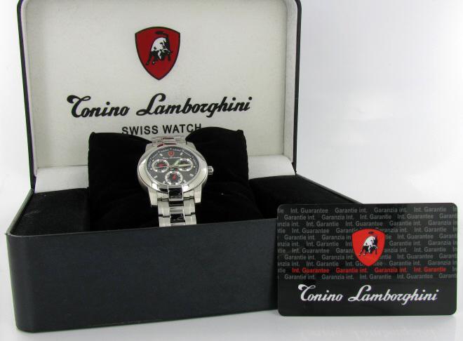 Brand New Tonino Lamborghini men's stylish sport chrono style watch in excellent new condition; with date, day and month dials; stainless case and band; box and papers; retail $2295