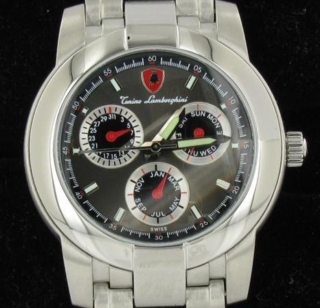 Brand New Tonino Lamborghini men's stylish sport chrono style watch in excellent new condition; with date, day and month dials; stainless case and band; box and papers; retail $2295