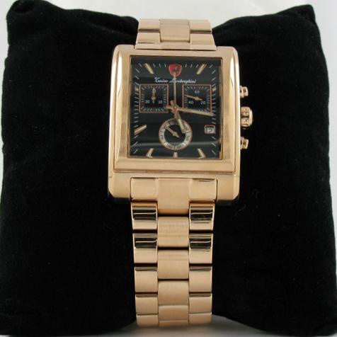 Brand New Tonino Lamborghini men's stylish sport chrono style tank shaped watch in excellent new condition; with date, day and dual seconds dials; 18k clad stainless case and band; box and papers; retail $2795