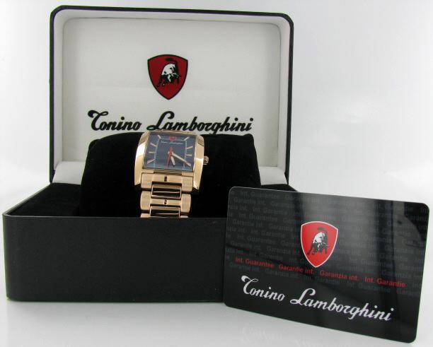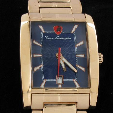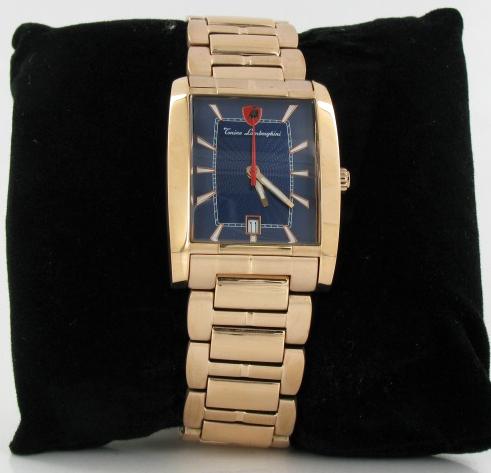 Brand New Tonino Lamborghini men's stylish sport Deco style tank shaped watch in excellent new condition; with date dial; 18k clad stainless case and band; box and papers; retail $2495