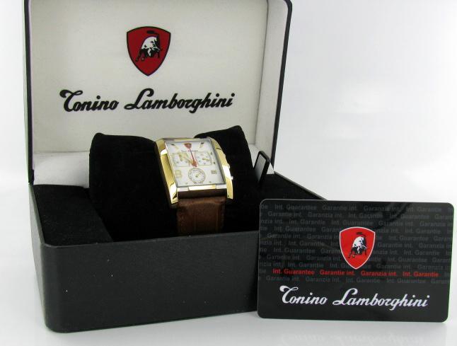 Brand New Tonino Lamborghini men's stylish sport chrono style tank shaped watch in excellent new condition; with date, day and dual seconds dials; 18k clad stainless case and leather band; box and papers; retail $2495